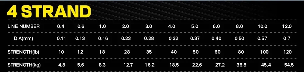 Parámetro de 8 hilos Número de línea 1.0# - 0,16 mm - 22 lb - 10 kg Número de línea 2.0# - 0,23 mm - 31 lb - 14,1 kg