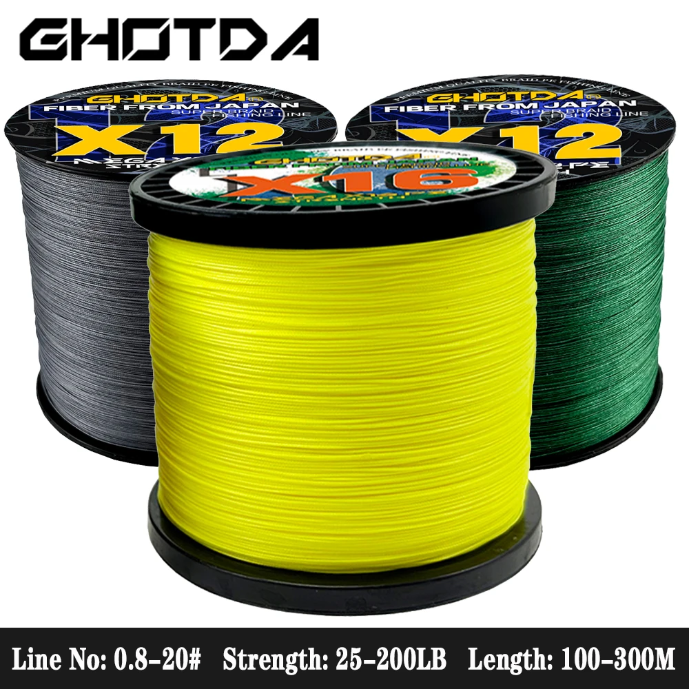 Líneas de pesca trenzadas X12 X16, cordón suave de 12/16 hebras, multifilamento PE, resistente a la abrasión, para pesca en el mar, 25-200lb, 100M, 300M