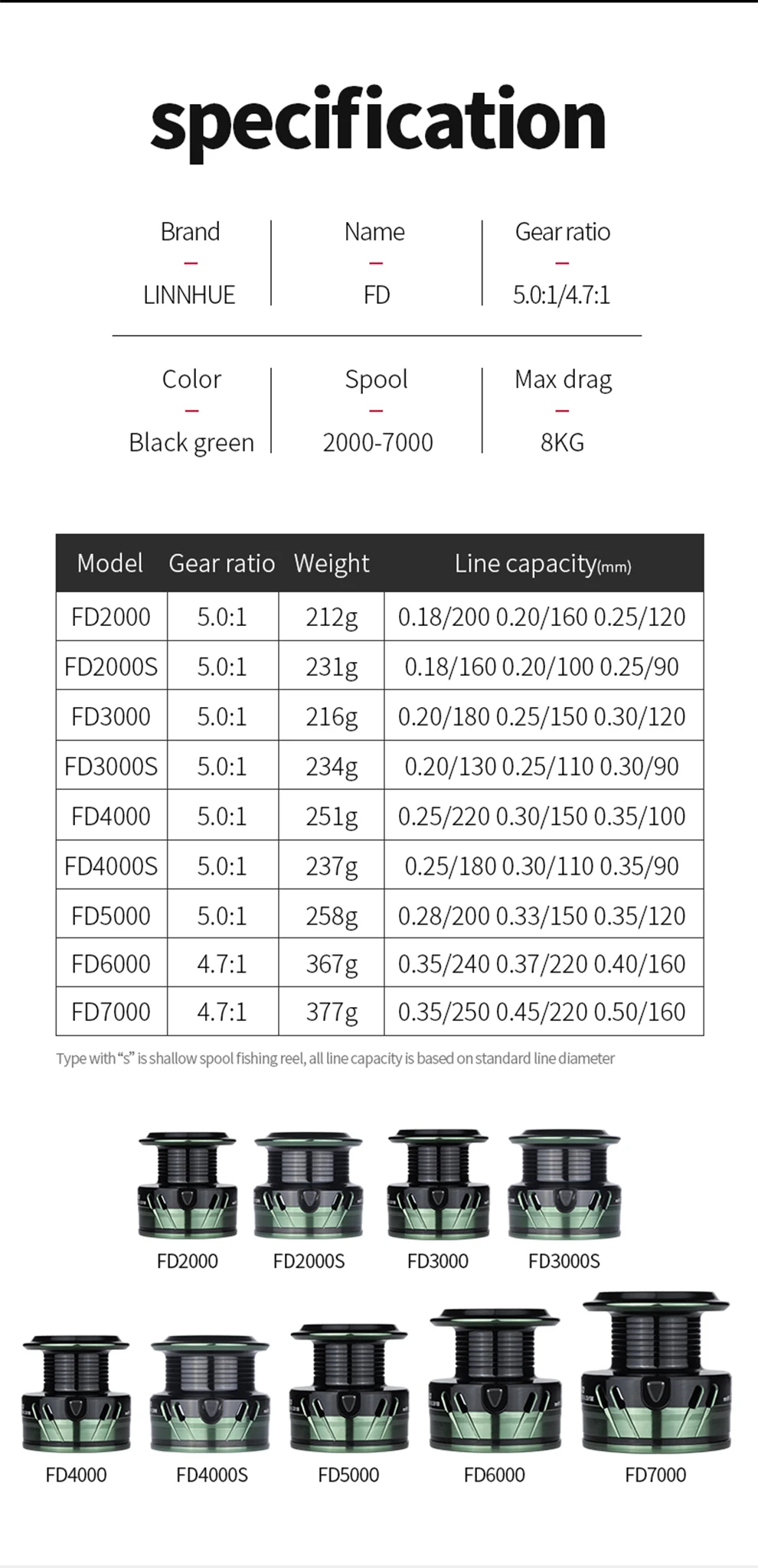 + El tipo con "S" es un carrete de pesca de bobina superficial, la capacidad de todo el sedal se basa en el diámetro estándar del sedal