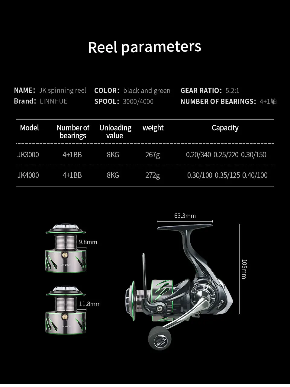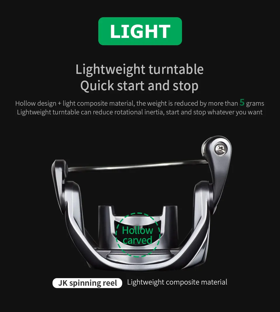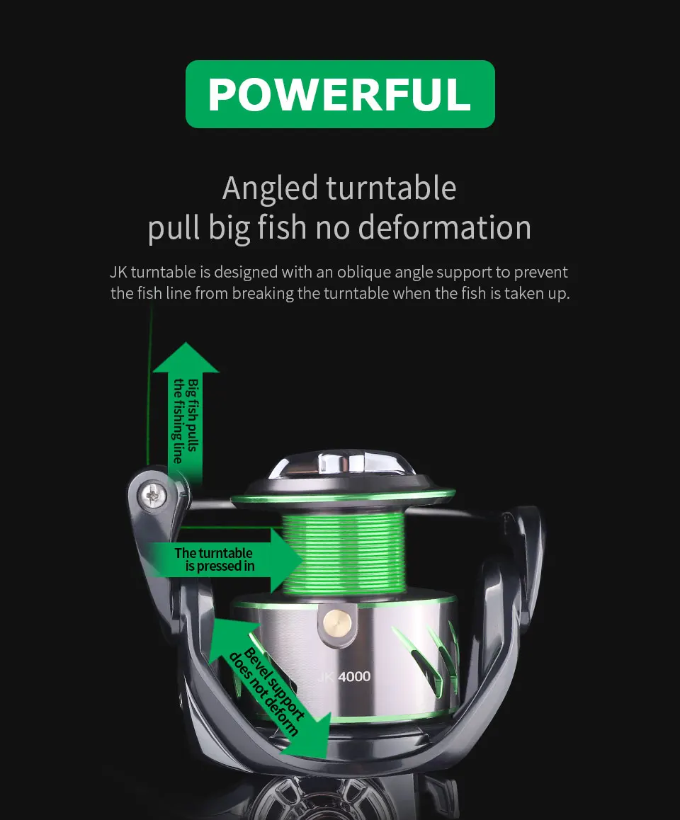 + El plato giratorio JK está diseñado con un soporte de ángulo oblicuo para evitar que el sedal rompa el plato giratorio cuando se levanta el pez.