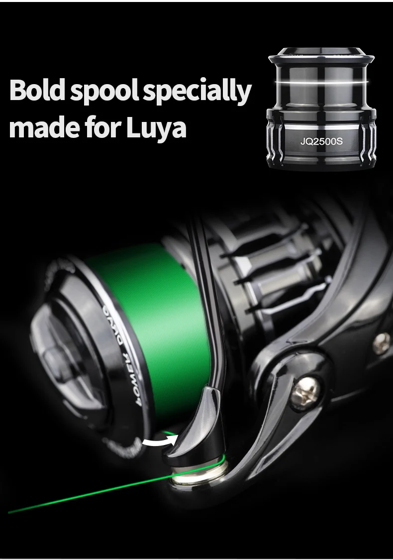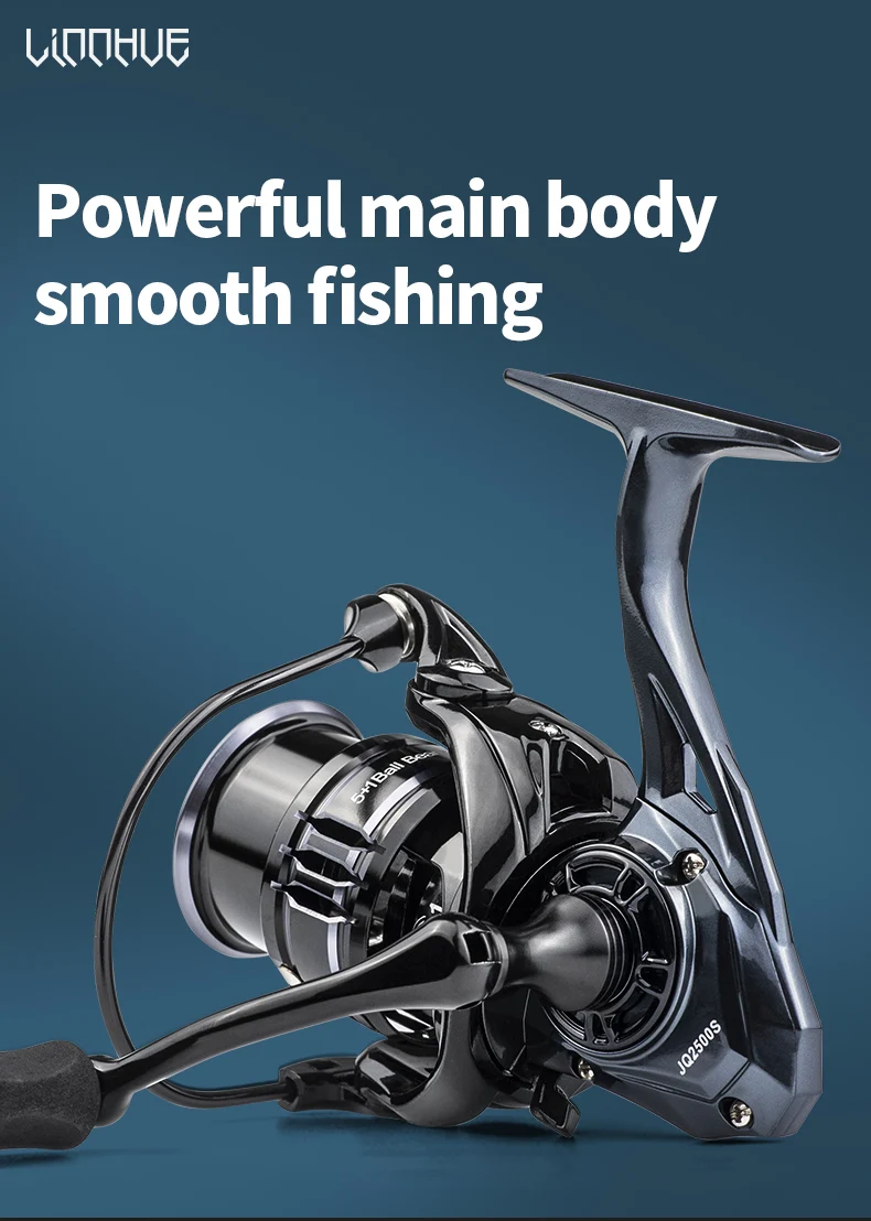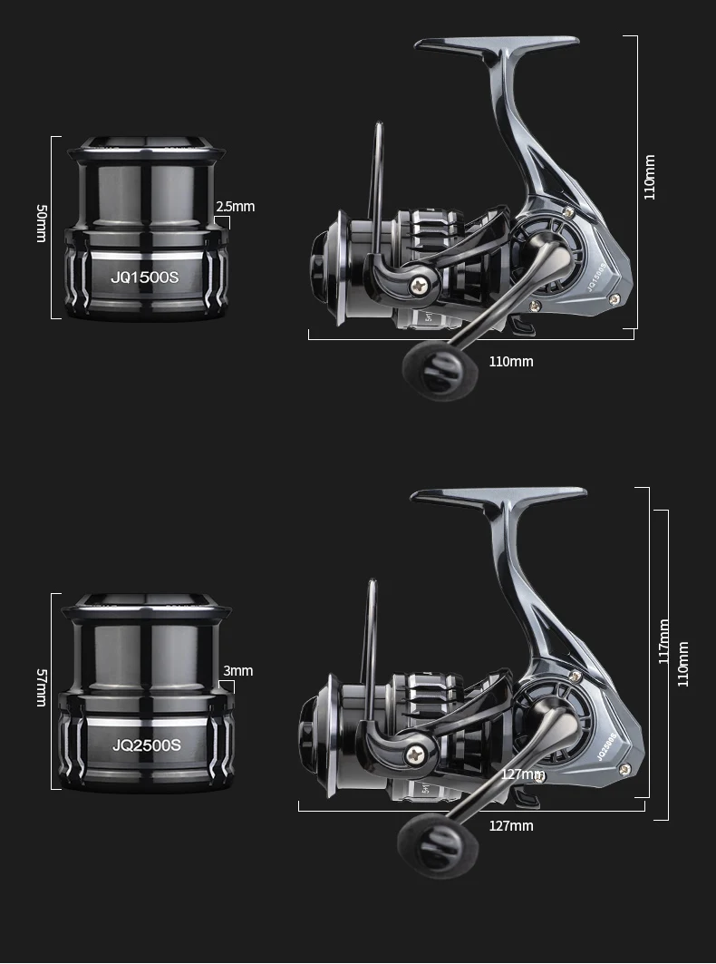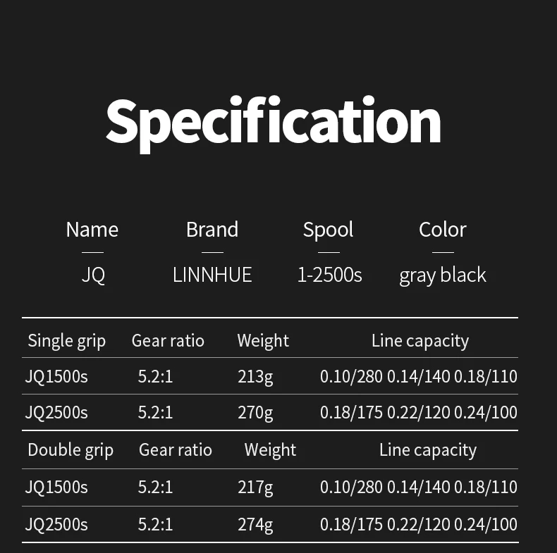 Marca: LINNHUE+ Carrete: 2500Color: gris negroSerie: JQ2500s /1500s+ De relación: 5,2: 1+ Línea capacidad 2500s:0,18/175,0, 22/120/0,24/100+ Línea capacidad 1500s:0,10/280,0, 14/140/0,18/110