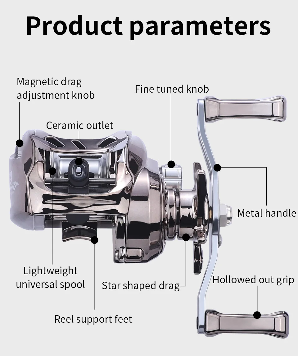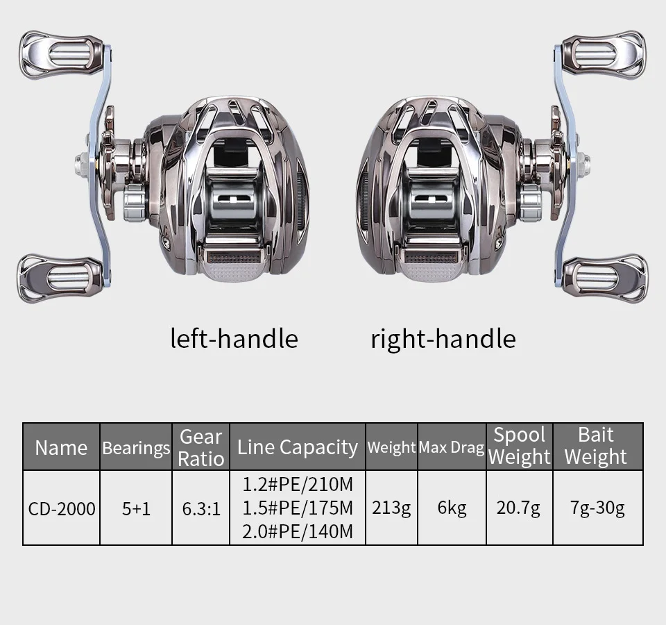 Nombre: CD-2000Rodamientos: 5 + 1Gear Radio: 6,3: 1Capacidad de Línea: 1,2 # PE/120M1,5 # PE/175M2,0 # PE/140MPeso: 213GArrastre máximo: 6kgPeso del carrete: 20,7GPeso del cebo: 7g-30g