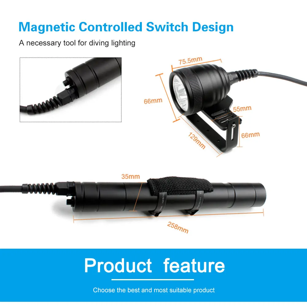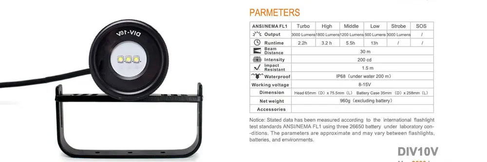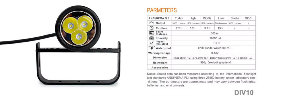 The DIV10 split diving flashlight adopts 3 * XM-L2 U4 LED, with a brightness of 3000 lumens. The magnetic switch design is not only easy to operate, but can meet your requirements for multiple output modes. It is also safer and more convenient to use underwater. Use three 26650 rechargeable lithium batteries to meet your underwater lighting needs. The low brightness range can achieve an ultra long endurance of 13 hours, the medium brightness range can achieve an ultra long endurance of 5 hours, the high brightness range can achieve an ultra long endurance of 3 hours, and the high brightness range can achieve an ultra long endurance of 2 hours. 120 ° luminous angle and 150 m diving depth make this flashlight your choice for technical diving and scuba diving.