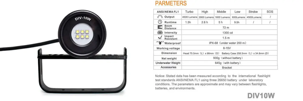 The DIV10 split diving flashlight adopts 3 * XM-L2 U4 LED, with a brightness of 3000 lumens. The magnetic switch design is not only easy to operate, but can meet your requirements for multiple output modes. It is also safer and more convenient to use underwater. Use three 26650 rechargeable lithium batteries to meet your underwater lighting needs. The low brightness range can achieve an ultra long endurance of 13 hours, the medium brightness range can achieve an ultra long endurance of 5 hours, the high brightness range can achieve an ultra long endurance of 3 hours, and the high brightness range can achieve an ultra long endurance of 2 hours. 120 ° luminous angle and 150 m diving depth make this flashlight your choice for technical diving and scuba diving.