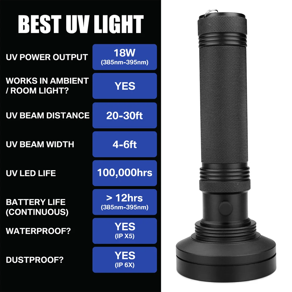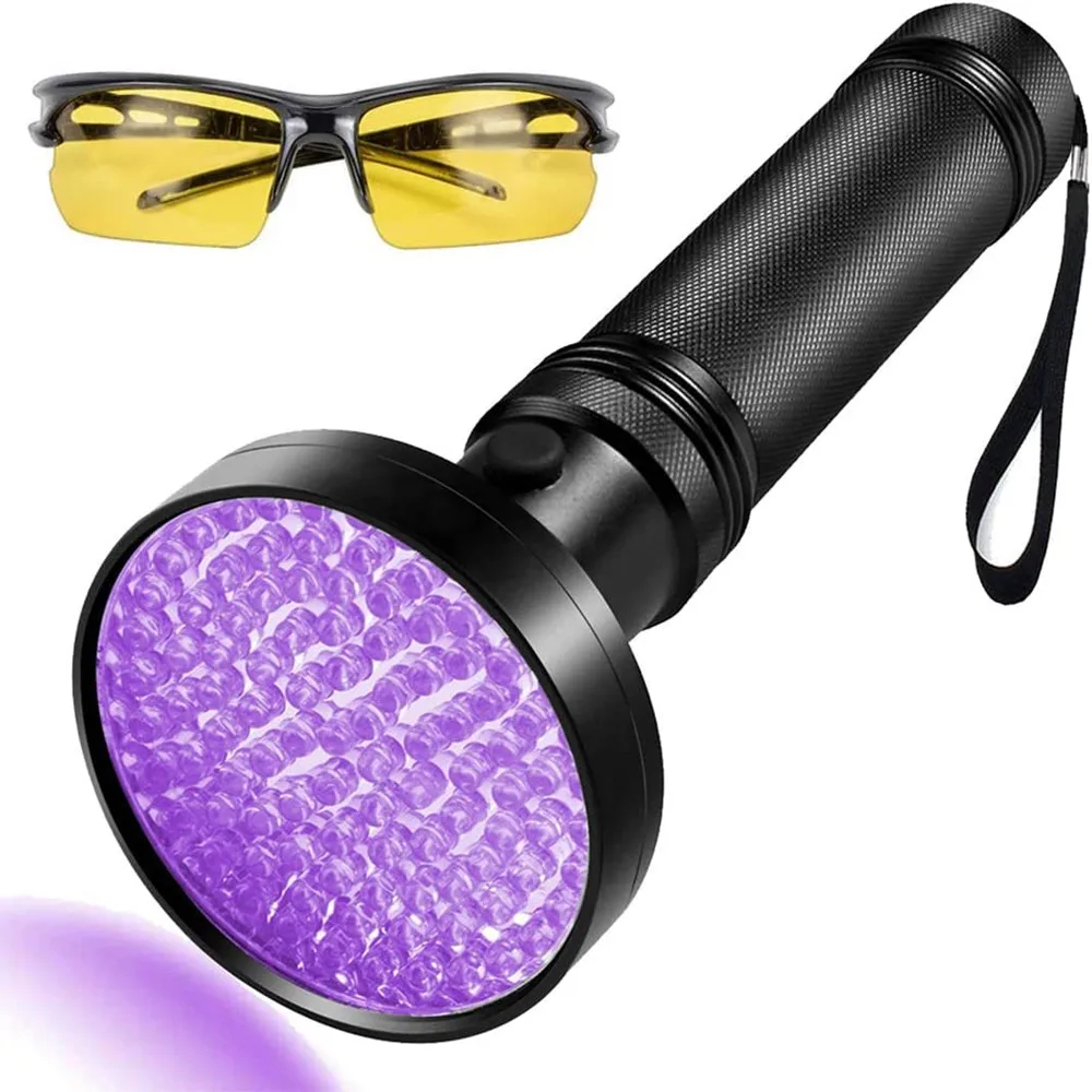 Linterna con detección ultravioleta de 100 LED1. Esta linterna emite una longitud de onda UV (ultra violeta) de 395 nm con 100 LED que pueden cubrir un área mucho más grande sin perder la intensidad de la luz ultravioleta.2. Puedes utilizar esta luz negra para detectar algunos tipos de dinero falso, joyas, colecciones, etc.Uso exterior como encontrar escorpiones y minerales.3. Revela las manchas de orina de las mascotas en alfombras y muebles con esta luz de mano.Úselo para control de seguridad, contaminación de roedores, inspección de habitaciones de hotel y mucho más.4.Herramienta de antorcha UV esencial para aplicaciones de la ley, inspecciones postales, aduanas, medicina forense, reparación de HVAC, etc.5.Fuente de alimentación: se requieren 6 pilas AA pero no incluidasEspecificación:Tipo de cuenta de lámpara: LED UV de 395 nmPotencia del LED: 2WVoltaje nominal: 9,0 VCantidad de LED: 100 piezasVida útil del LED: 100.000 horasDistancia de irradiación: 100 mTiempo de iluminación: 20 horas (depende de la batería)Alimentación por: 6 pilas AA de 1,5 V (no incluidas)Dimensiones de la linterna (H*D): 7,5" x 3,0"(1,5")Material del producto: caucho de PVC + carcasa de aleación de aluminio.