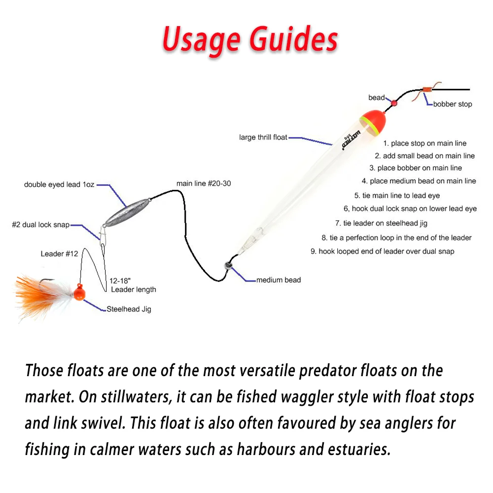 Esos flotadores son uno de los flotadores de depredadores más versátiles del mercado.En aguas quietas, se puede pescar estilo waggler con topes flotantes y eslabones giratorios.Este flotador también es a menudo favorecido por los pescadores marinos para pescar en aguas más calurosas como cuerdos y estuarios.