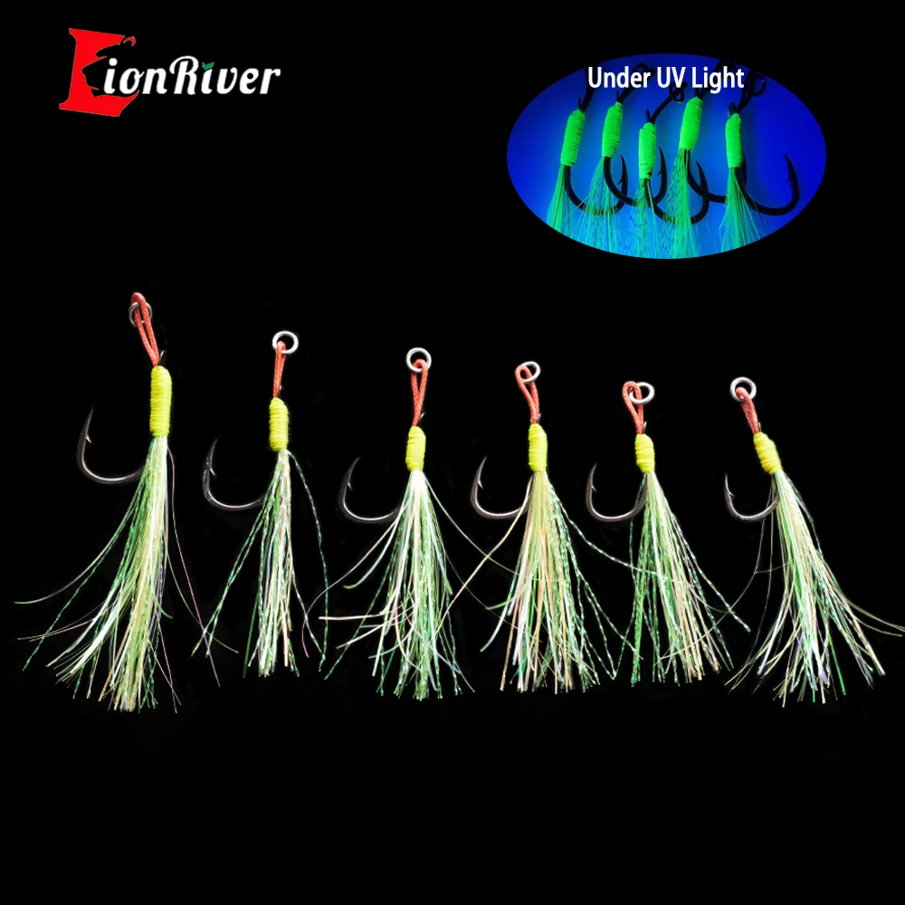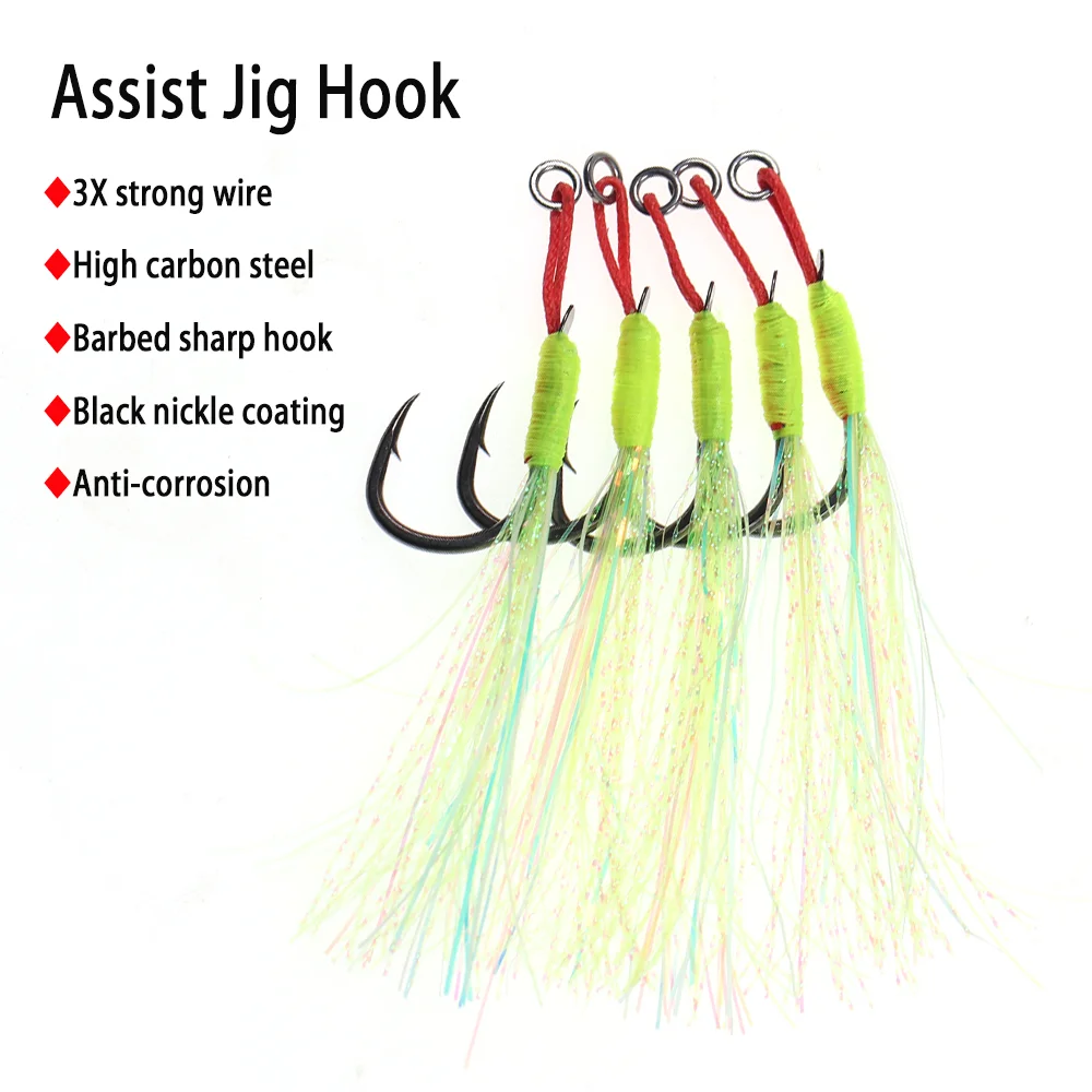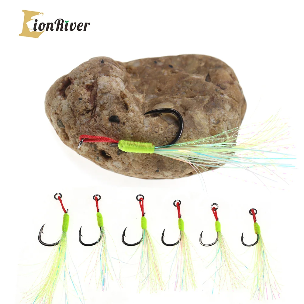 LIONRIVER, 5 uds., anzuelo de asistencia de cola de plantilla de Metal, señuelo de pesca, Jigging lento, pesca de púas, único anzuelo, línea de PE, pluma, anillo sólido