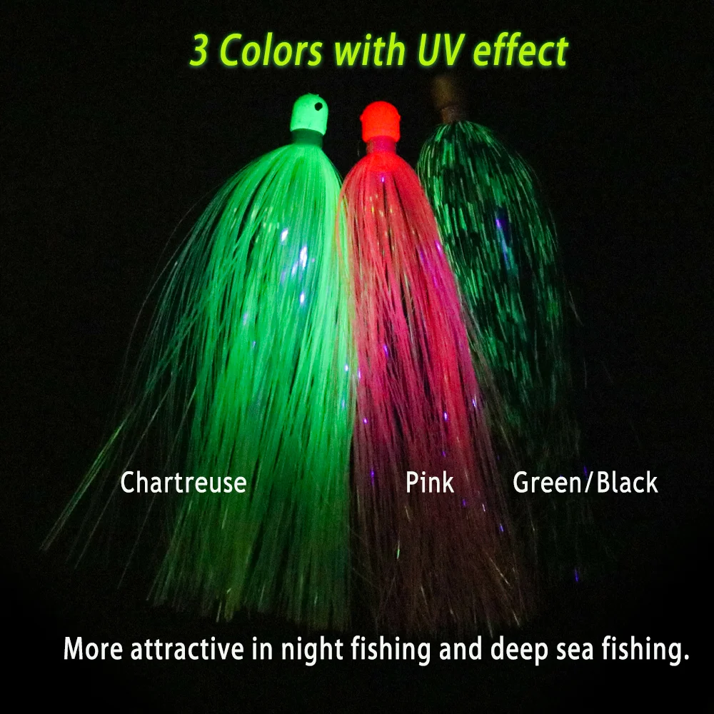 2. Rosa, Chartreuse, verde/negro con efecto UV, perfecto para la noche y la pesca en aguas profundas.