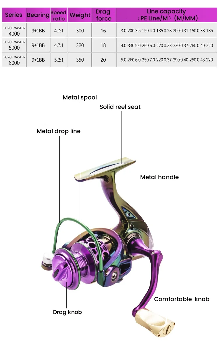 LIZARD carrete giratorio colorido carrete de aleación manija de tienda perilla lagarto 1000-6000 serie 9 + 1 rodamiento, perilla diferente de arrastre de 8kg