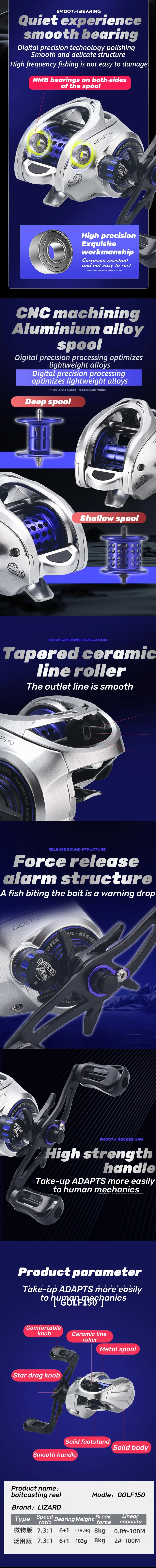 Lizard Lightweight 178g con sistema magnético de carrete de aleación de aluminio CNC profundo y poco profundo con carrete de baitcasting de 2 rodamientos NMB