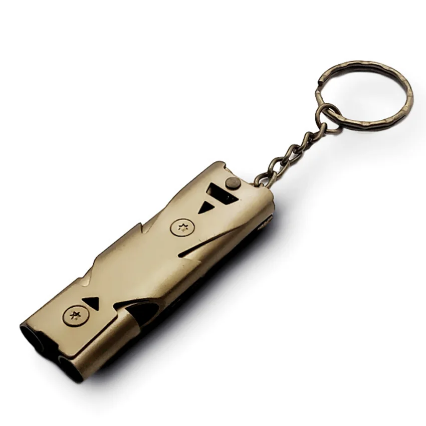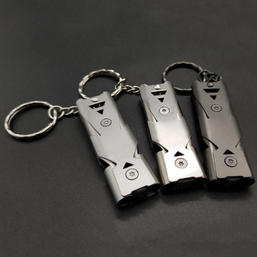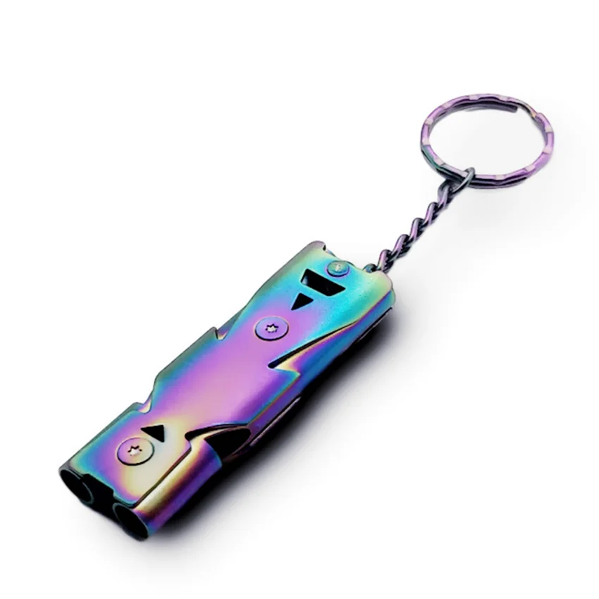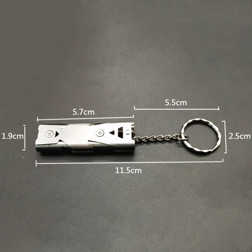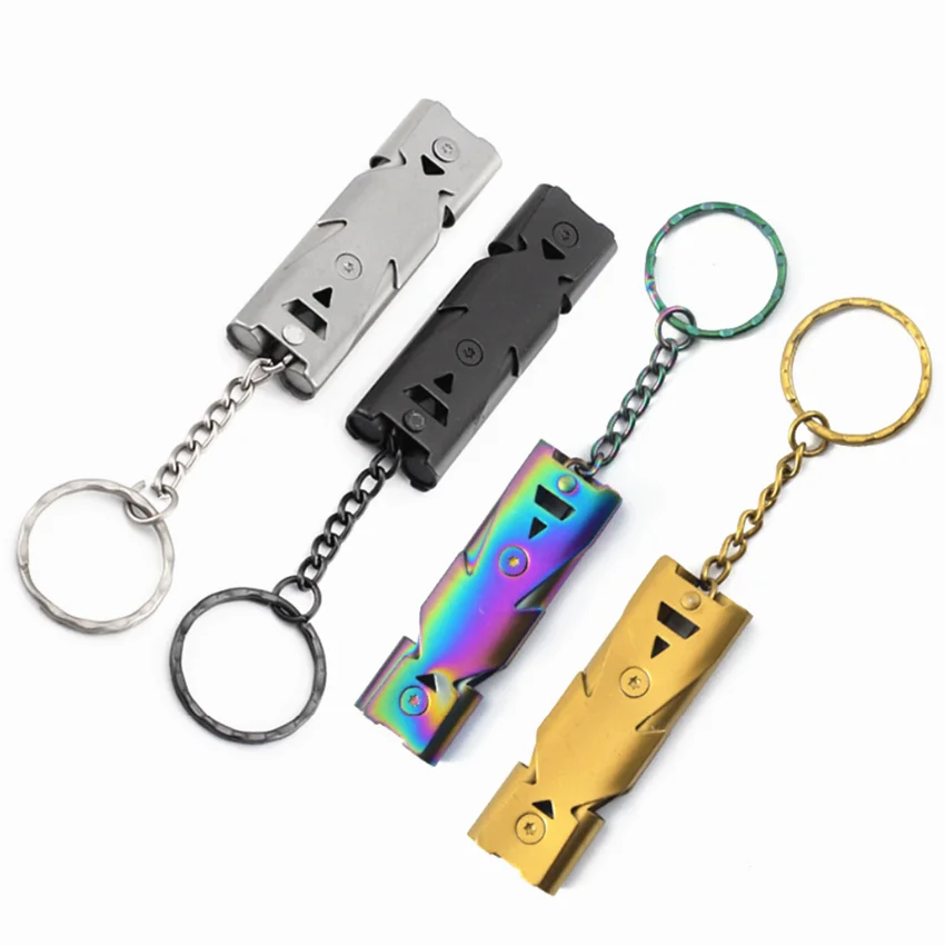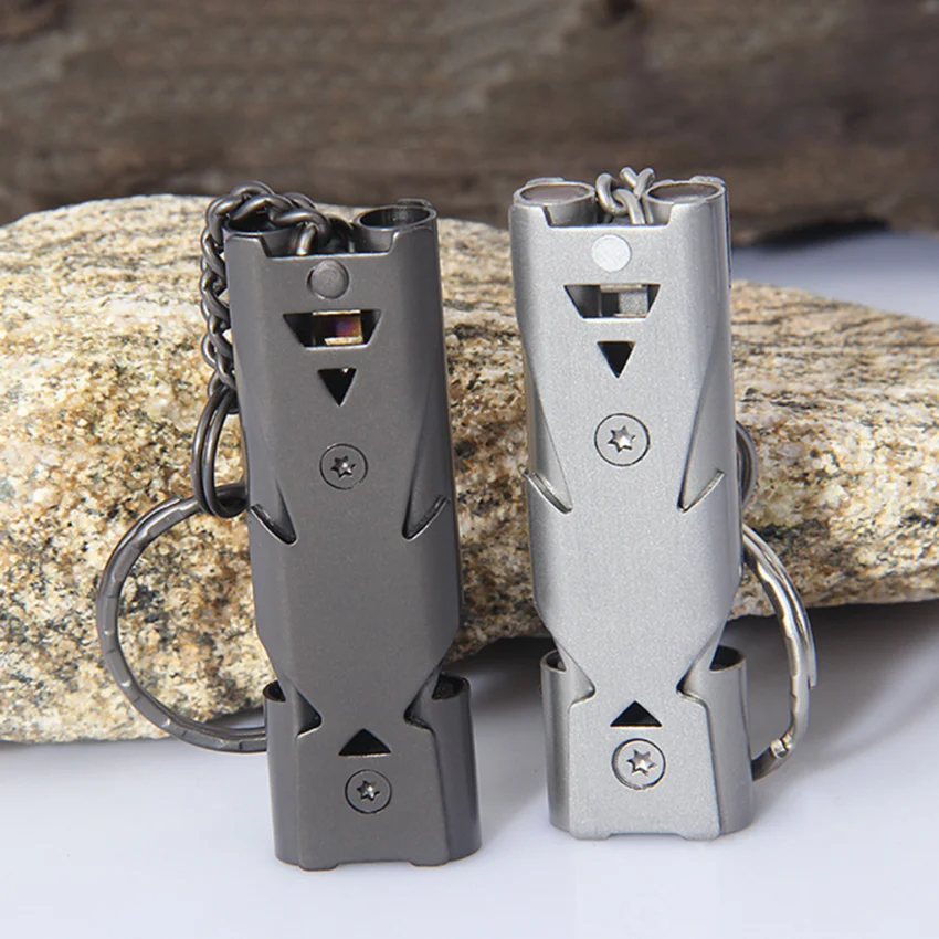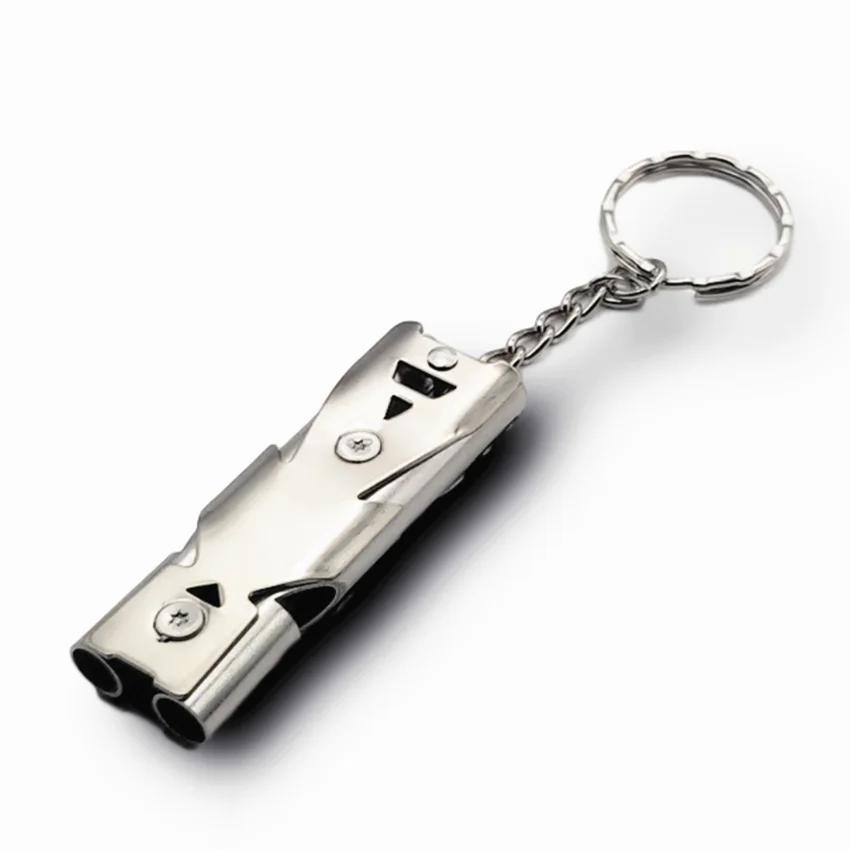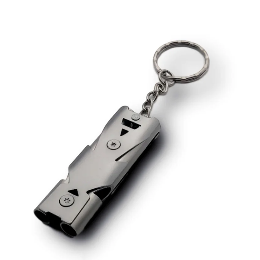 Llavero portátil de alto decibelio para exteriores, silbato de acero inoxidable, doble tubo, herramientas multifunción de supervivencia de emergencia