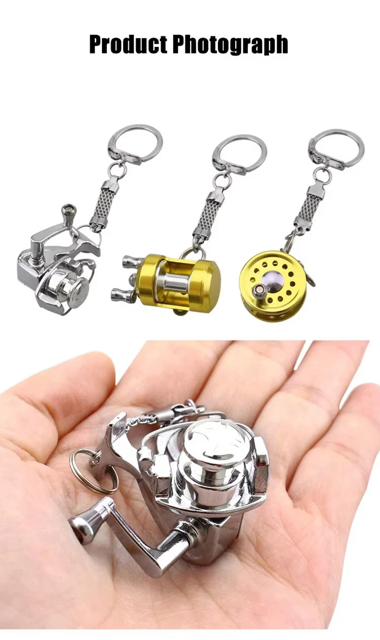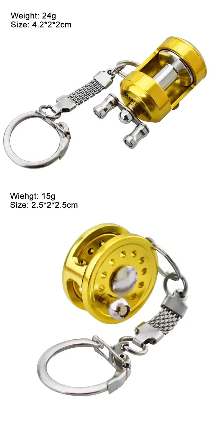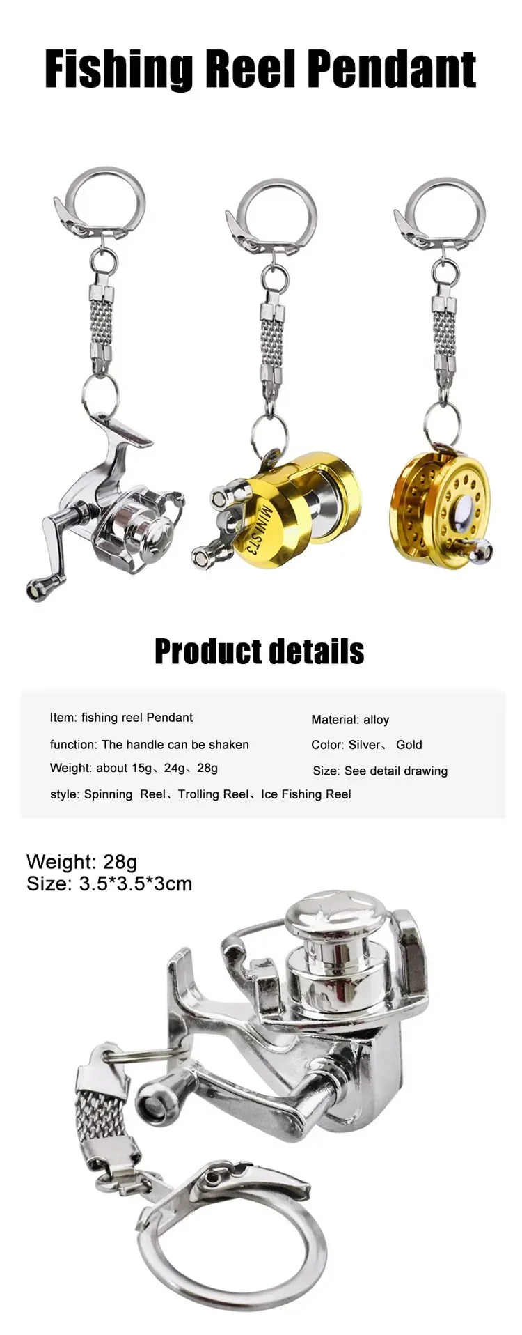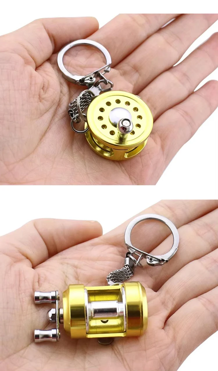 Llavero con rueda de pez, Color dorado, pescador con mosca, carrete de pesca giratorio, personaje, llavero en miniatura con llavero100% nuevo