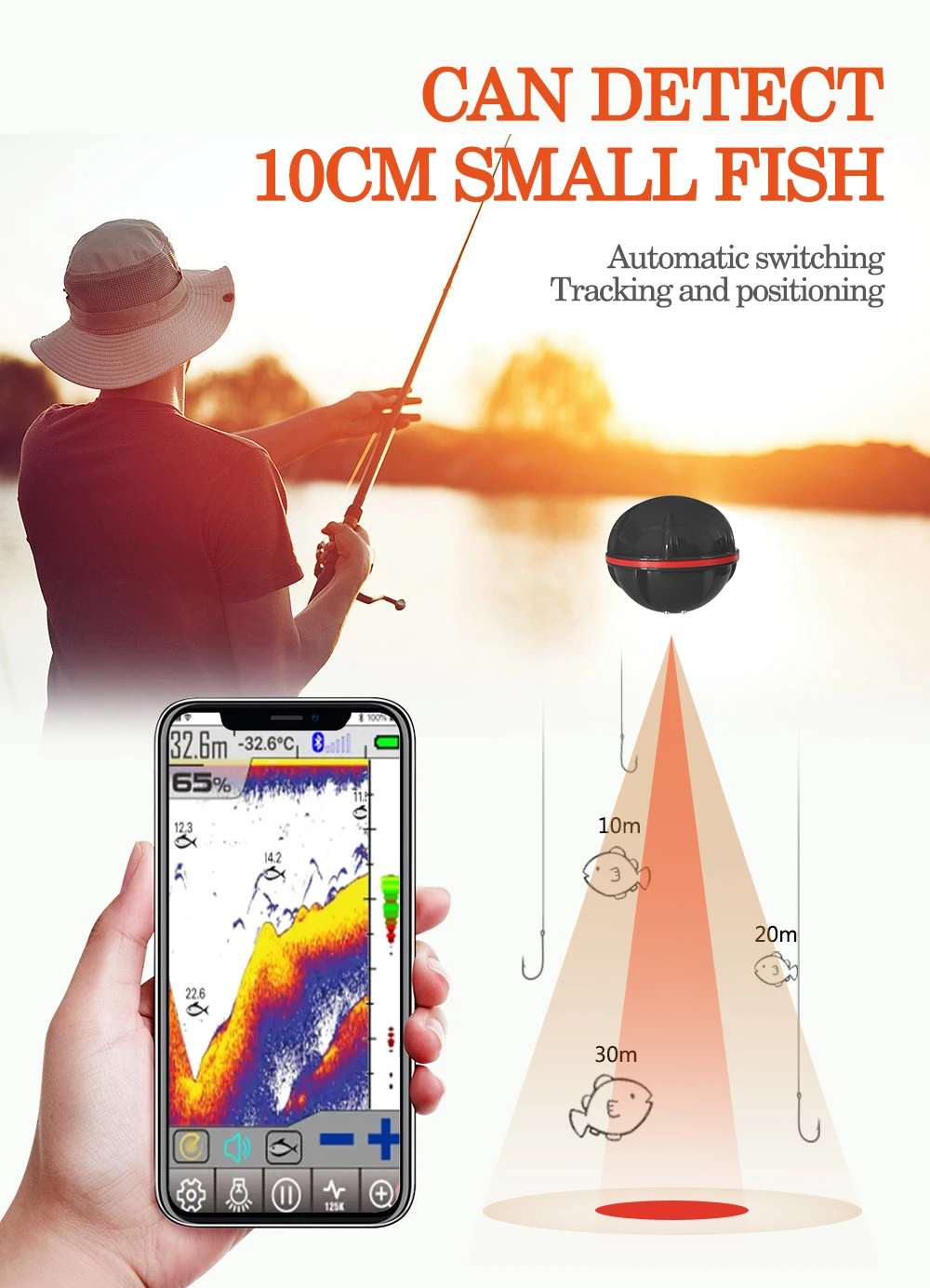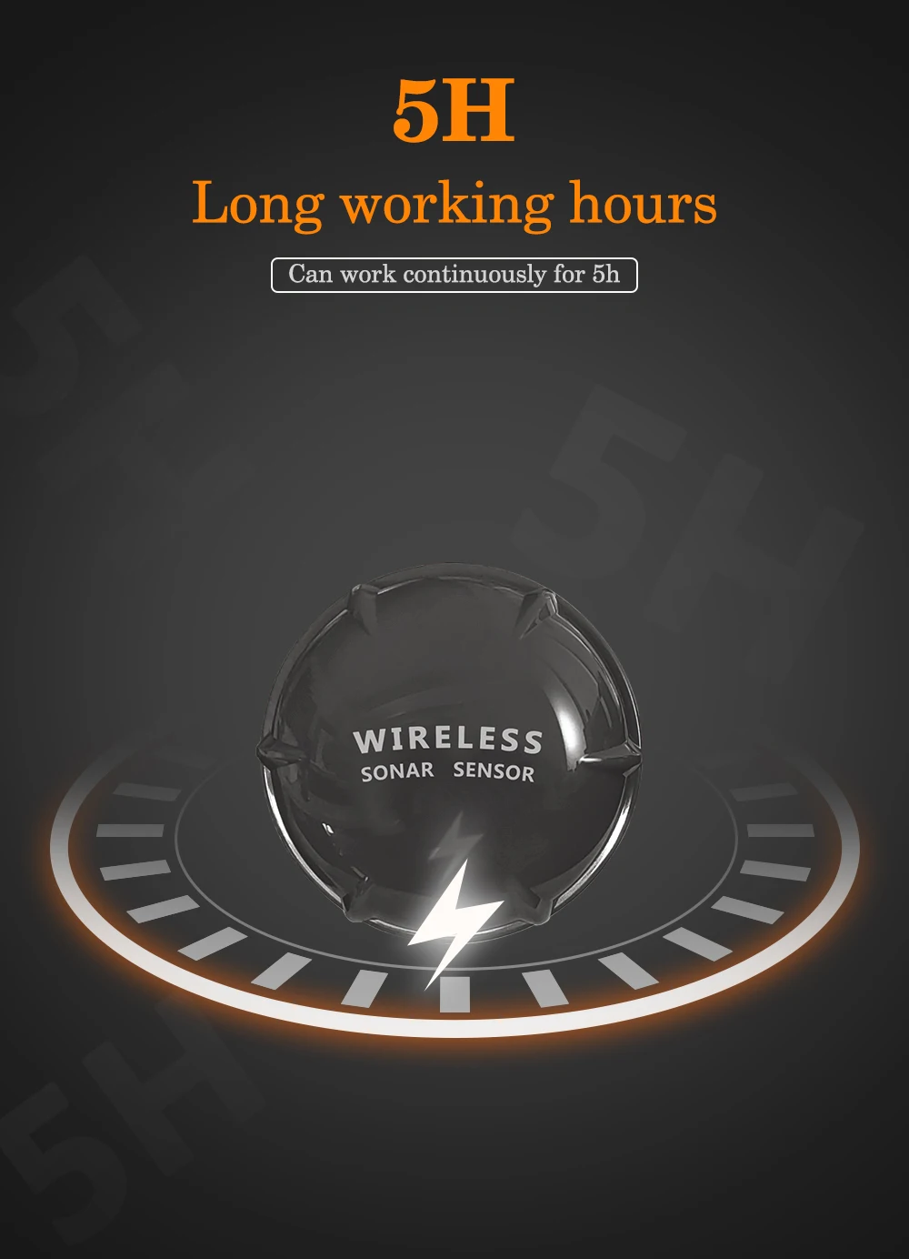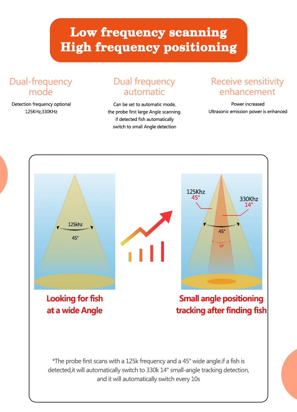 Para que el usuario seleccione, la frecuencia del sonar es de 125KHz, profundidad de hasta 200 pies/60m, con batería recargable de iones de litio de 3,7 V, el tiempo de uso es de hasta 10-20 horas.