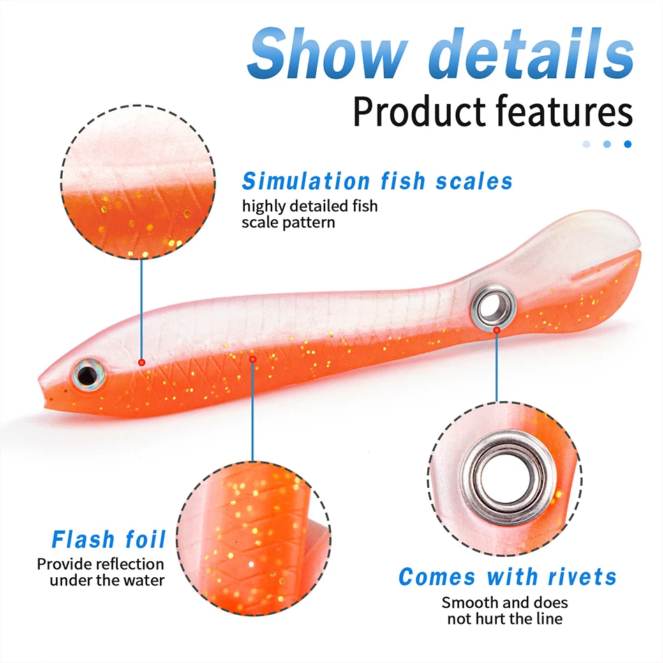 🐟Señuelo realista▶El señuelo de pesca puede hundirse lentamente y moverse con flexibilidad en el agua. El diseño de cola de paleta con material súper suave brinda una acción de natación extremadamente atractiva para atraer peces hambrientos. Además, las acciones de natación realistas hacen que atraiga más capturas y provoque que los peces depredadores ataquen.