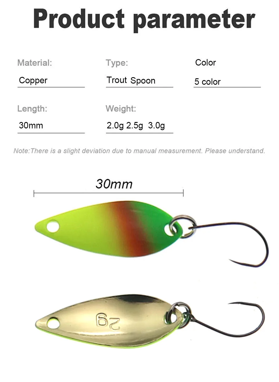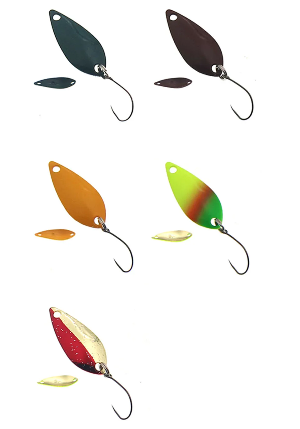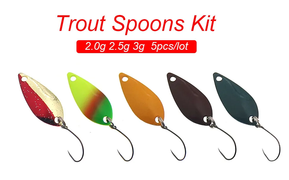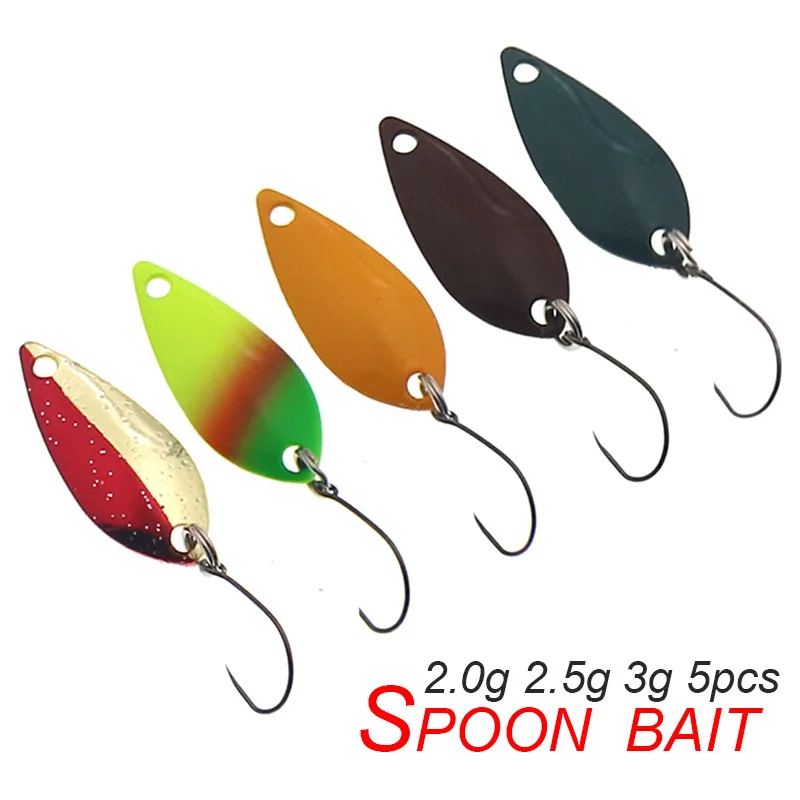 Lote de 5 cucharas de pesca de Metal, señuelos de trucha, kit de 5 piezas, 2g, 2,5g, 3g, cebo Artificial giratorio de lentejuelas, gancho único sin púa
