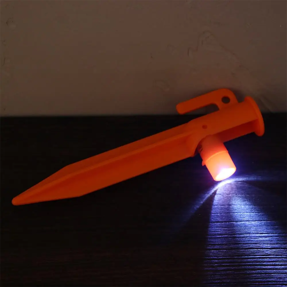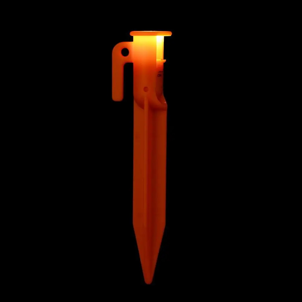 100% NEW Color: Orange Material: Plastic Length: 15CM Package includes 1 x Tent Pegs This is a very practical outdoor camping lights, 15cm in length You can easily put in your pocket, in your hand, in a backpack Very intimate and very user-friendly design Each camping loving people should not hesitate to buy it In order to facilitate your use, this product comes with 4 L41 button batteries Continuous lighting time of 24 hours or more. Rotary switch. Can be used as a flashlight. Built-in hook design, can be hung on the tent n