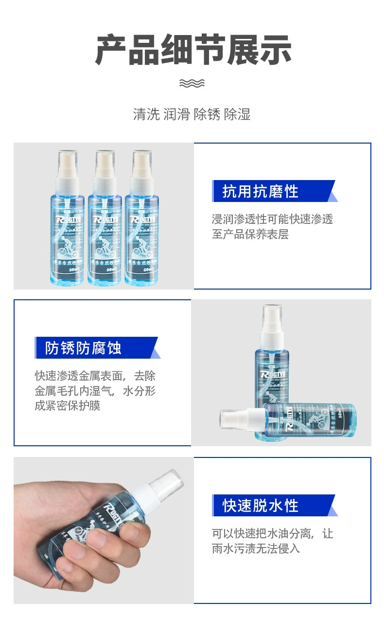 3. Prevención de óxido y polvo: este lubricante para cadenas de bicicletas se filtra rápidamente de las superficies metálicas, forma una película protectora de aceite y elimina el agua del metal y los agujeros.Tiene fuertes capacidades de moho y penetración que evitan que el óxido y el polvo dañen la cadena de su bicicleta.