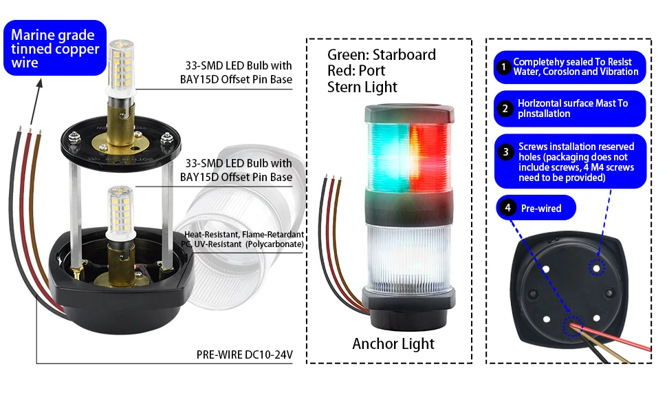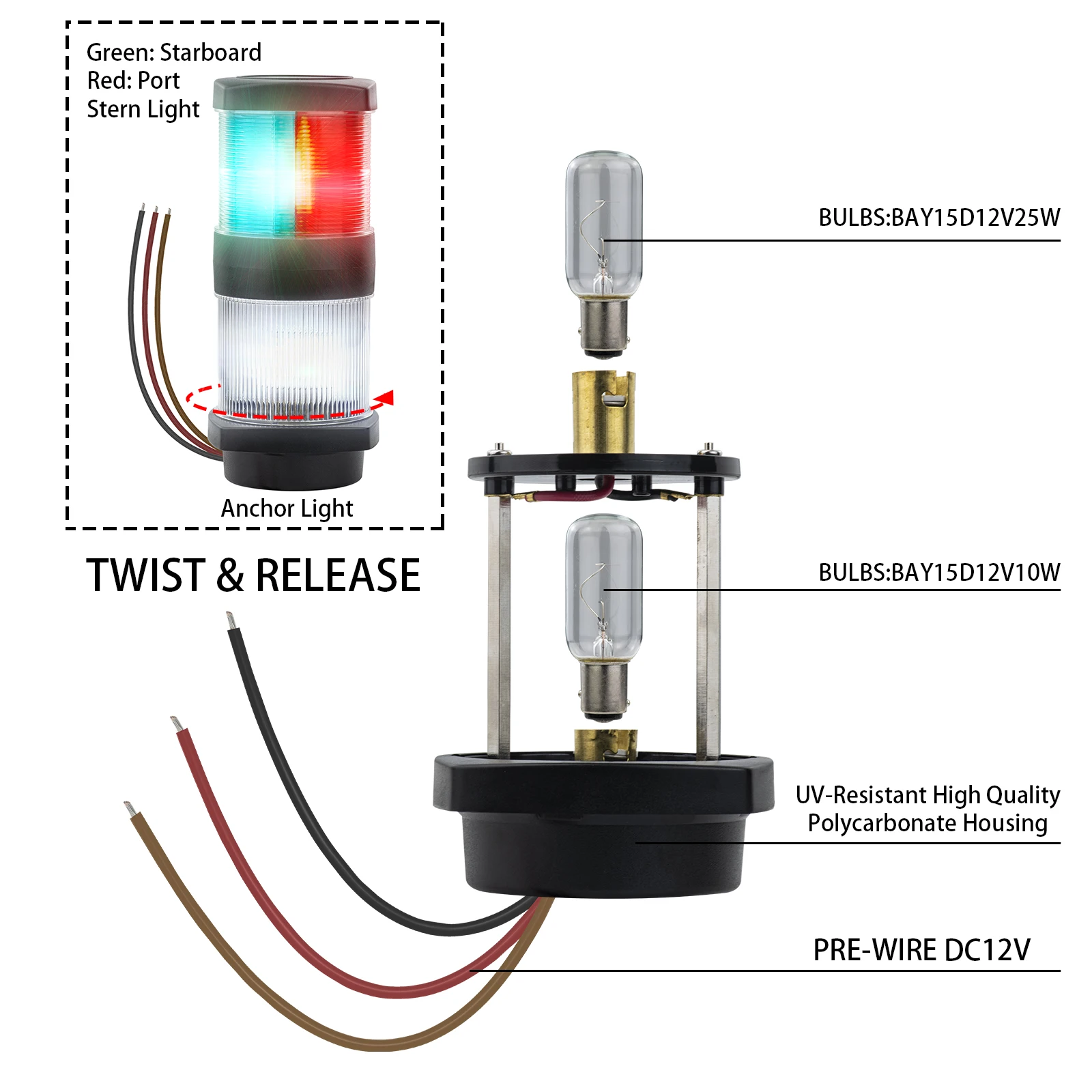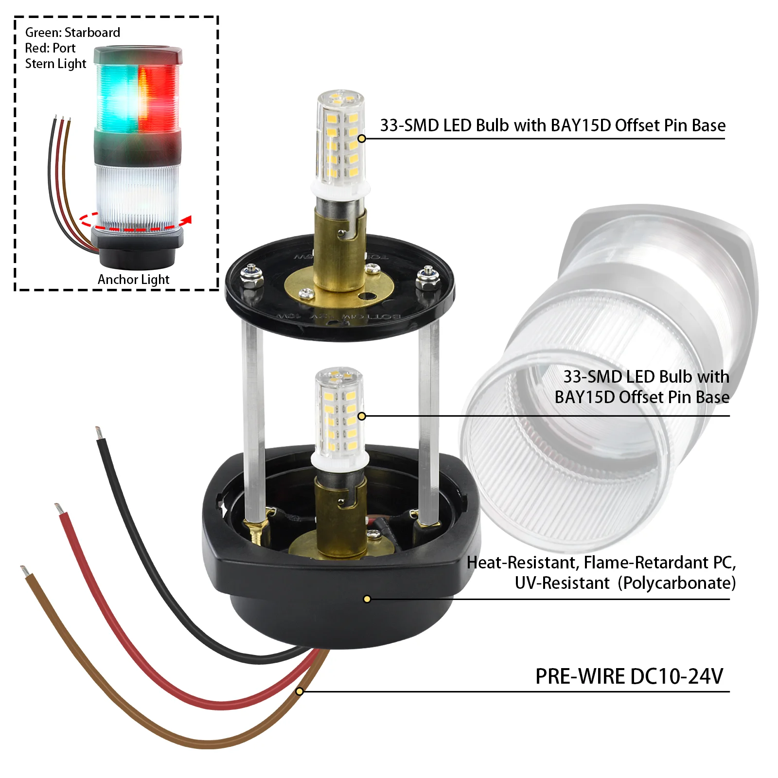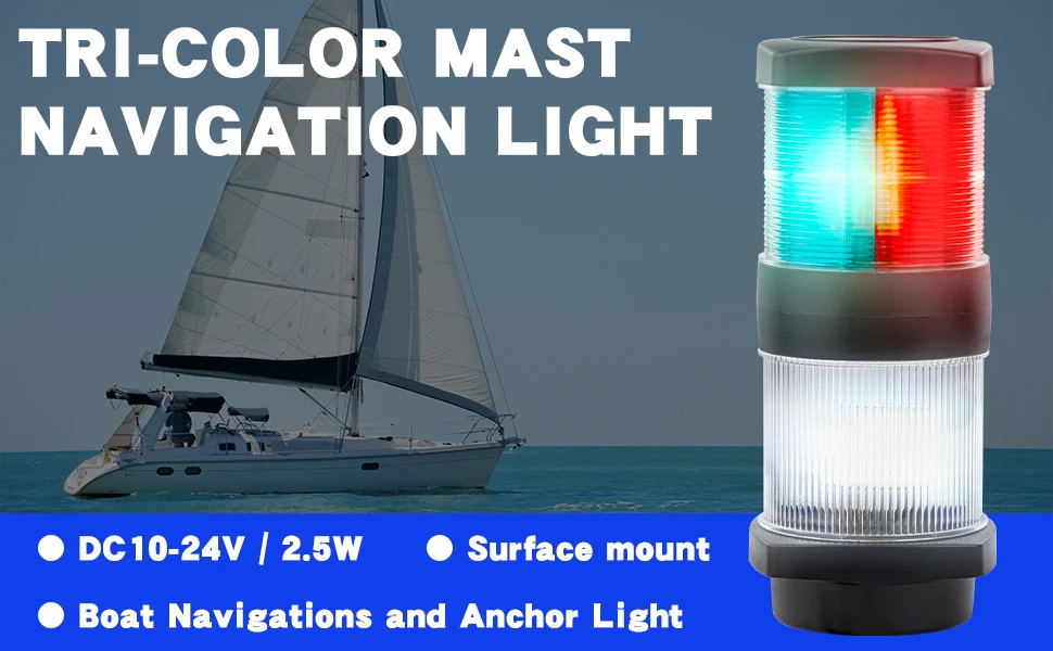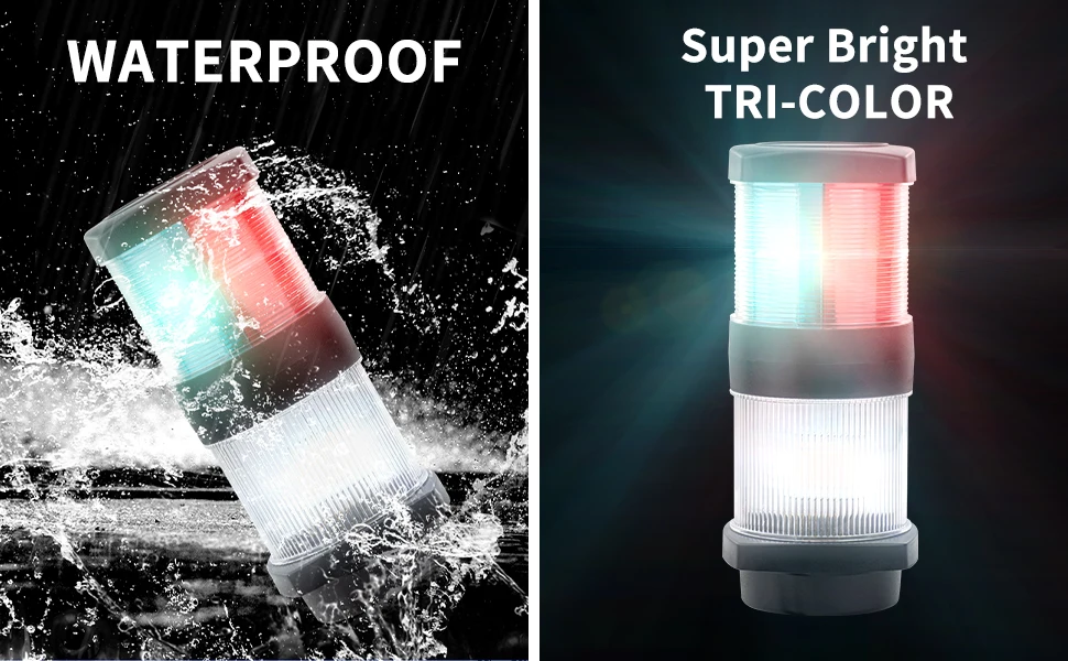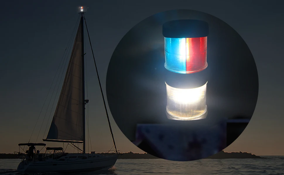 DISEÑO TRI-COLOR: Cuenta con luces de navegación rojas y verdes más luz de anclaje blanca en una sola unidad compacta, perfecta para veleros y embarcaciones marinas.