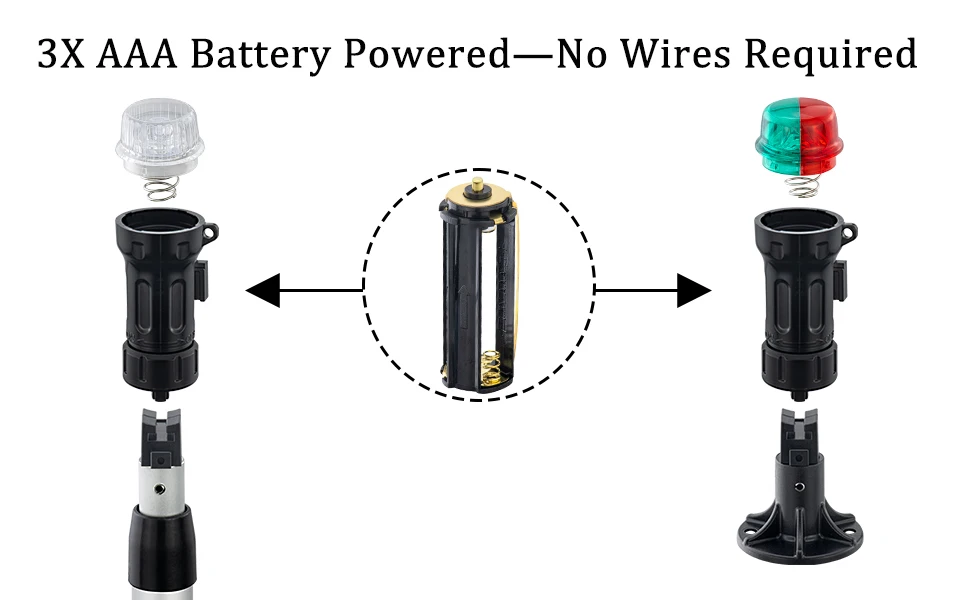 Características: Luz combinada de visibilidad/navegación de 1 NM y luz integral, alimentada por tres pilas AAA (no incluidas)