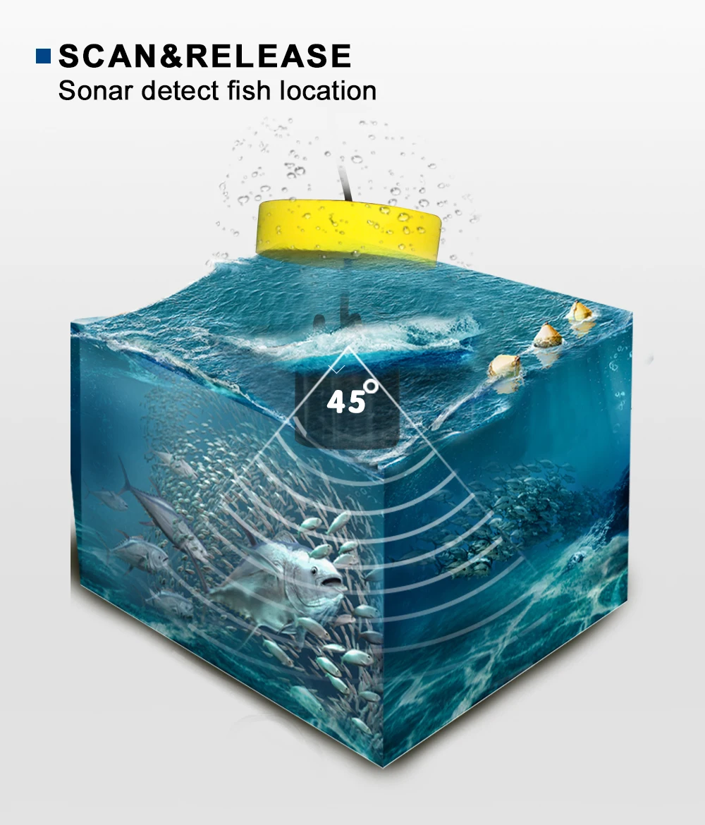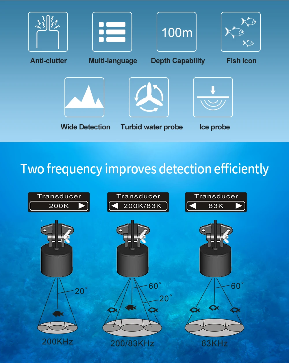 4) Cobertura del sonar: Ángulo de haz de 60 grados en 83Khz/Ángulo de haz de 20 grados en 200Khz