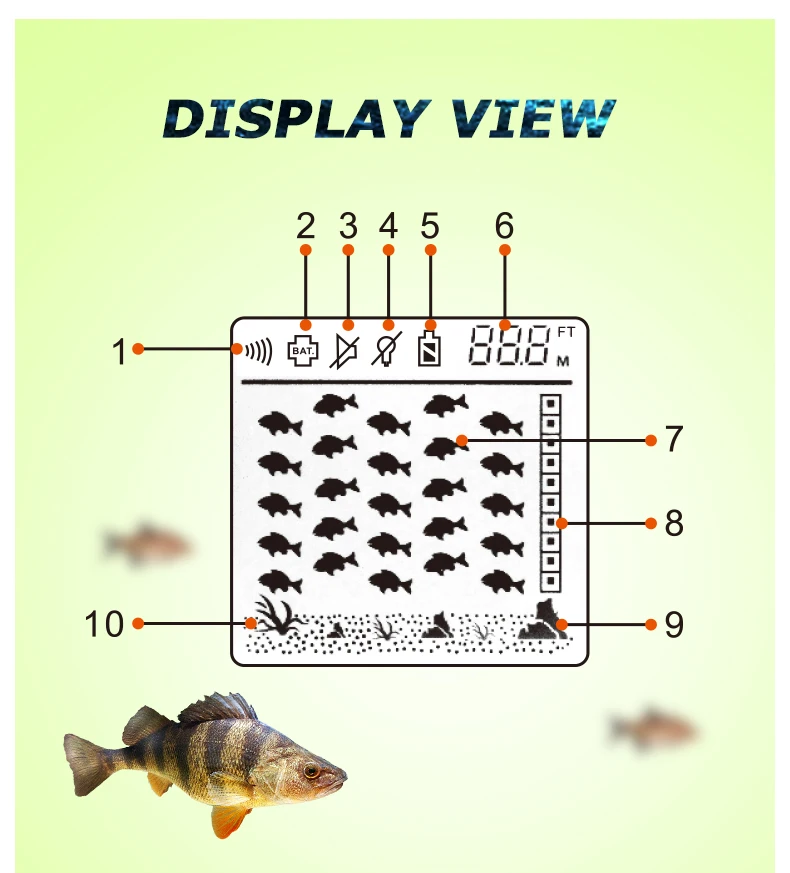 6) muestra la profundidad del agua, la ubicación de los peces, la hierba inferior y la roca