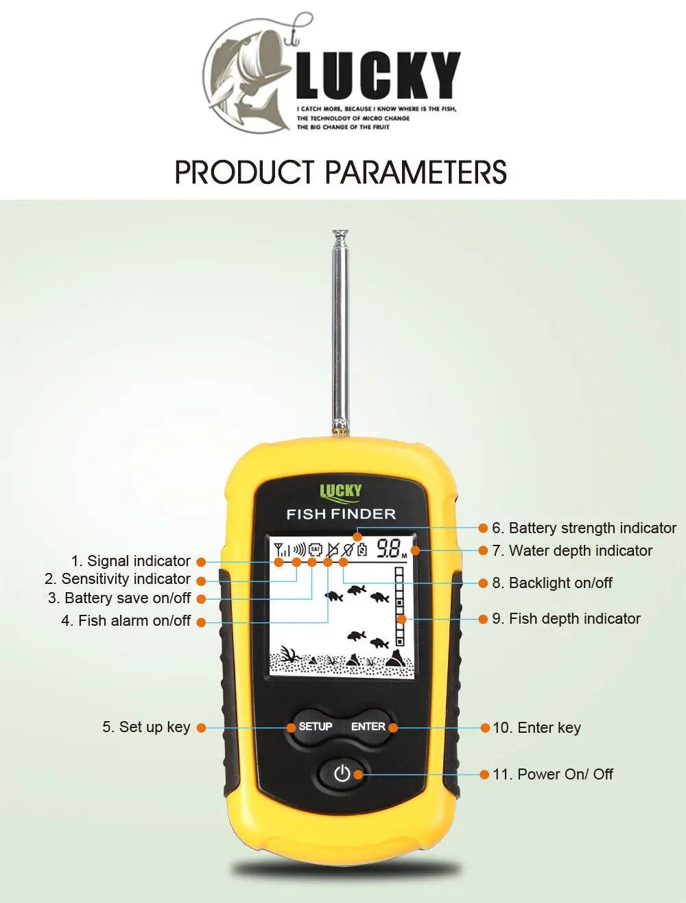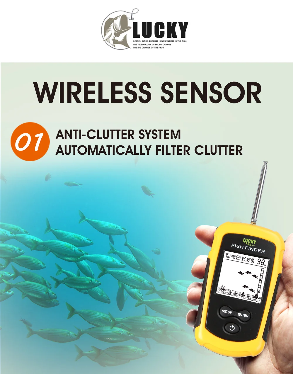Buscador de peces portátil LUCKY 120, rango de trabajo inalámbrico de 400 pies (M), ecosonda inalámbrica con pantalla en blanco y negro de 2 pulgadas