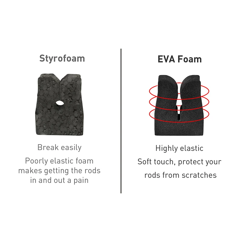 En el clip de varilla se utiliza material EVA, que es un nuevo tipo de material de protección ambiental.Tiene las ventajas de un buen amortiguador, antisísmico, aislamiento térmico, a prueba de humedad, resistencia a la corrosión química, etc.para proteger la superficie de la caña de pescar al máximo.