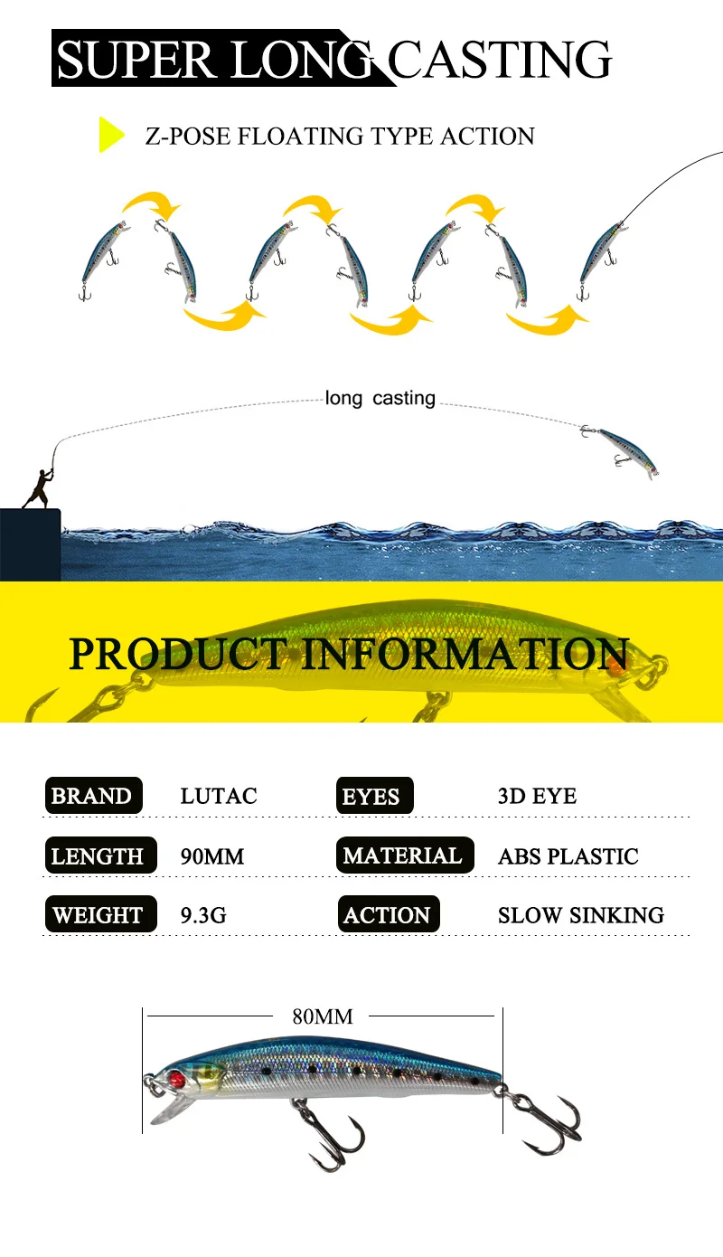 Cebo de pesca lutac 8 colores 90mm 9,3G señuelo de fundición larga trolling Peche de hundimiento lento