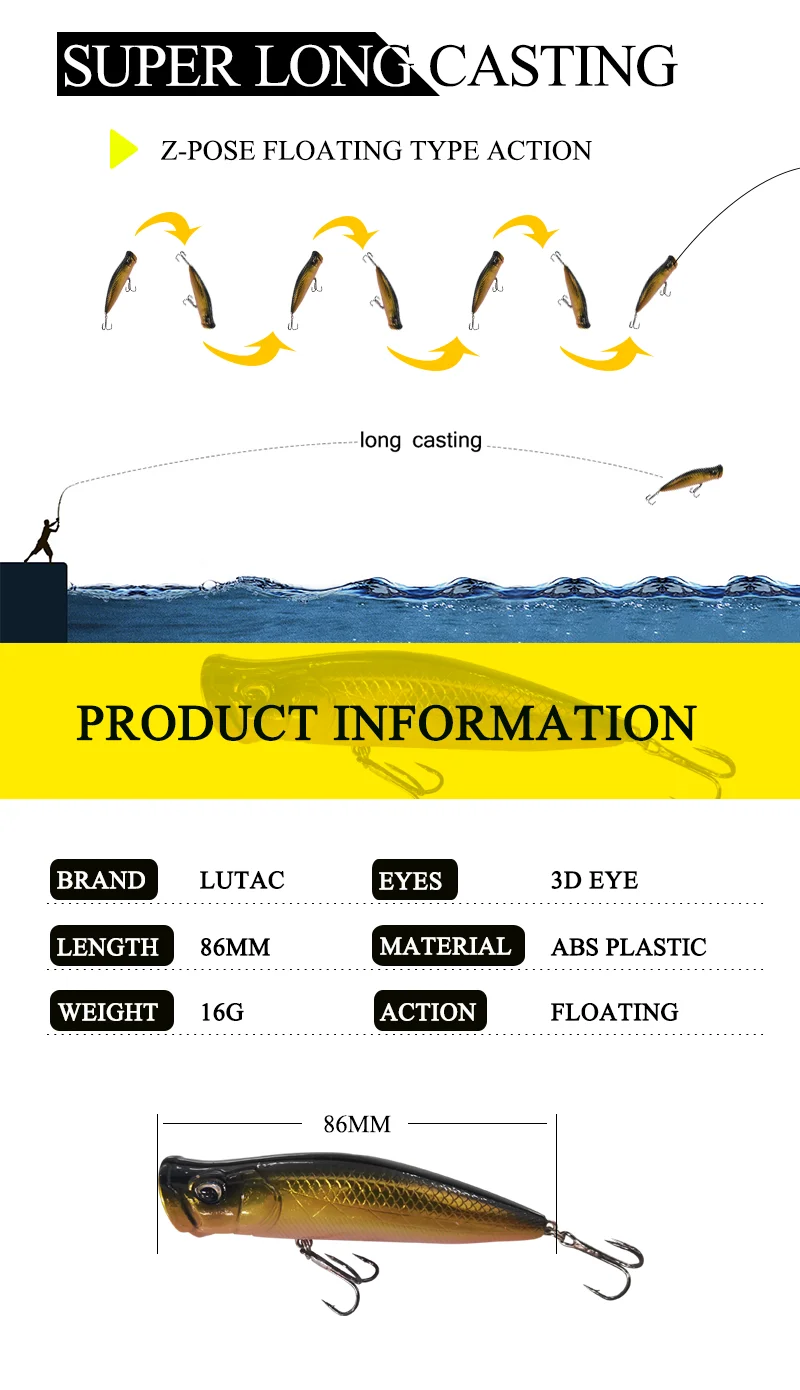 Nombre de la marca: LutacSerie: PopperFestuers: ojos 3DPeso: 16gLongitud: 86mmMaterial: plástico ABSAcción: FlotanteEmbalaje: 1 piezas/bolsa