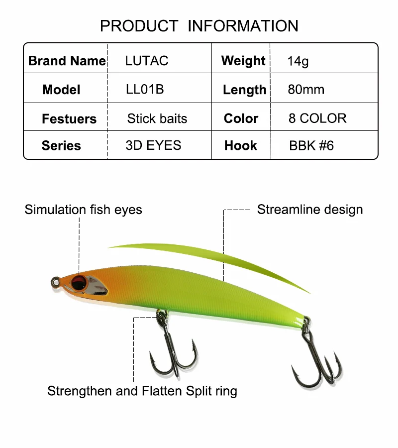 Marca: LutacPeso: 14gLongitud: 80mmMaterial: plástico ABSColor: 8 coloresGancho: Gancho BKK #6