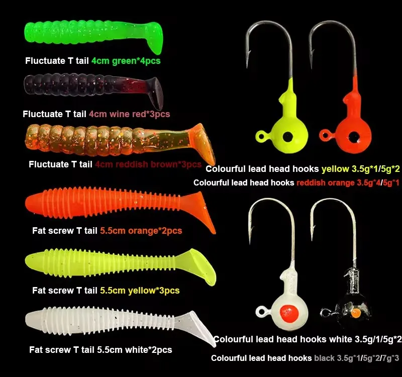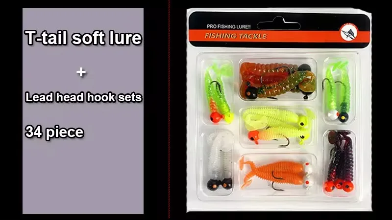 Luya cebo conjunto tornillo de grasa T cola de onda T cola de color cabeza de plomo gancho 34 piezas conjunto de cebo suave