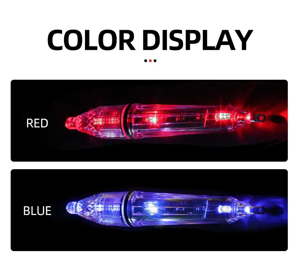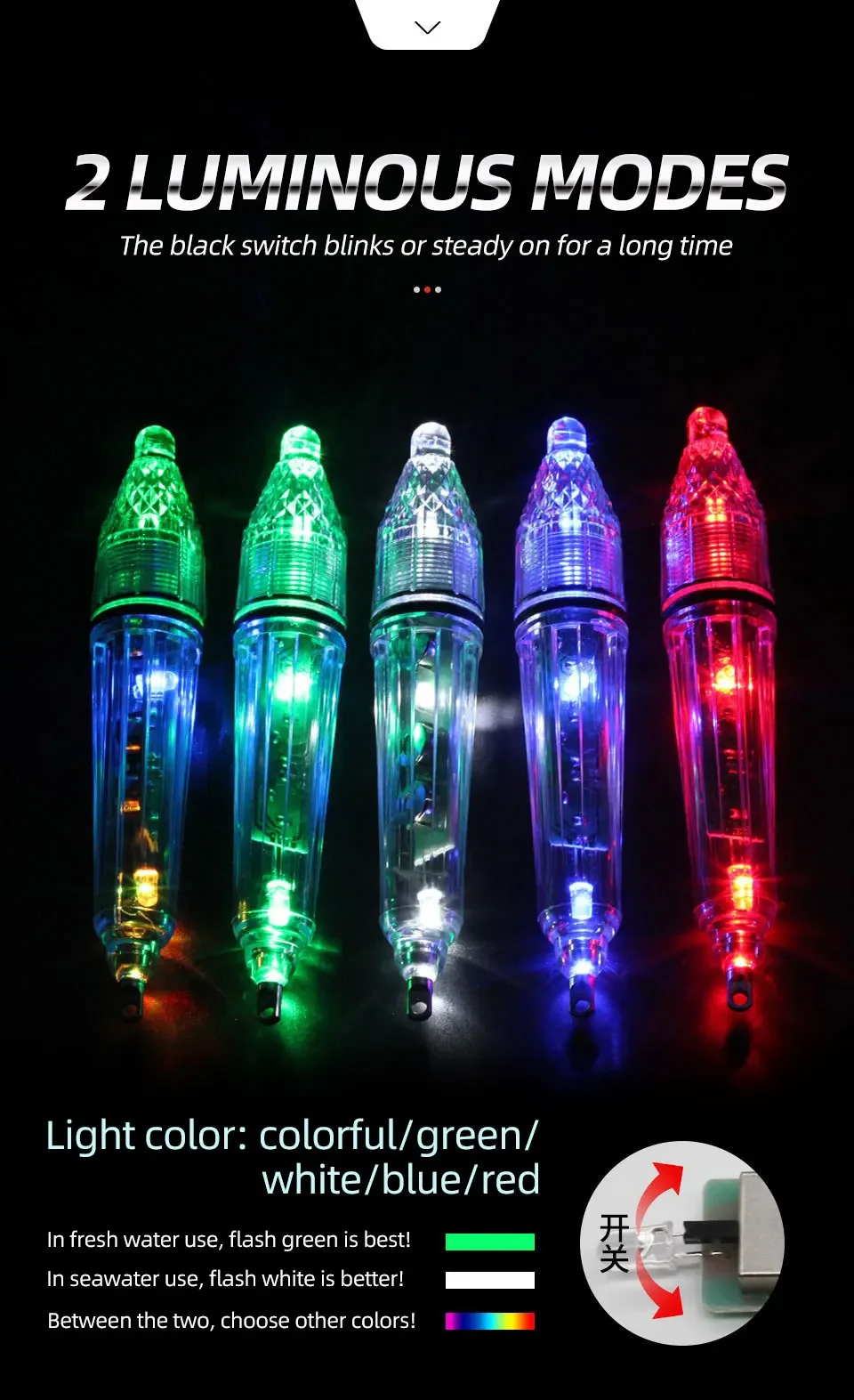 【Dos modos de iluminación】:Esta luz de cebo contiene 3 LED con iluminación de 360 grados y 2 modos de luz para que elijas.Agite el botón a la izquierda y la luz LED del pez mostrará destellos multicolores.Agite el botón derecho y la luz Deep Fishing parpadeará en un color fijo.
