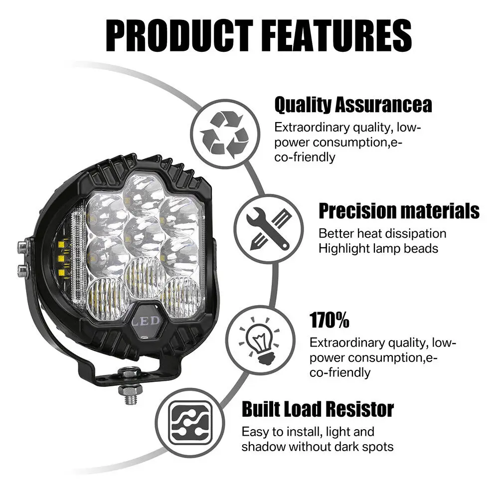 .Potencia del LED: 75W. Voltaje de funcionamiento: 10-30 CC. Tasa de impermeabilidad: IP 67, 15 piezas * 5 W LED de alta intensidad, iluminación clara y parpadeo del lado ámbar respectivamente. Color del cuerpo: negro, blanco. Temperatura de color: 6000K. Material: carcasa de aluminio fundido. Material de la lente: PC. Soporte de montaje: Acero inoxidable. Haz: patrón de haz de inundación (60 grados), haz puntual de 30 grados opcional. 30000 horas por encima de la vida útil. Tamaño: 5 POLEGADAS