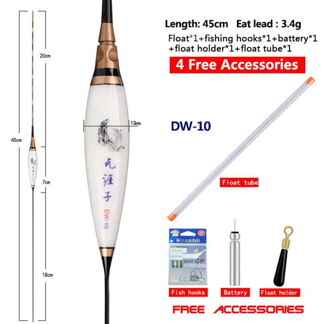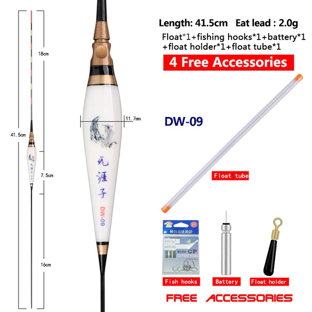 DW-09: longitud del artículo: 41,5 cm, longitud del pie: 16cm, longitud de la cola: 18cm, longitud del cuerpo: 7,5 cm, peso del artículo: 2,21g, peso del plomo de carga: 2,0g, diámetro del pie: 1,2mm, diámetro del cuerpo: 11,7mm, diámetro de la cola: 1,5mm, segmentos: 7