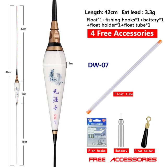 1 unidad de luz de pesca flotante + 1 batería + 1 tubo de boya + 1 soporte para flotador + 1 bolsa de ganchos de pesca de agua dulce Nano aparejos de pesca eléctricos