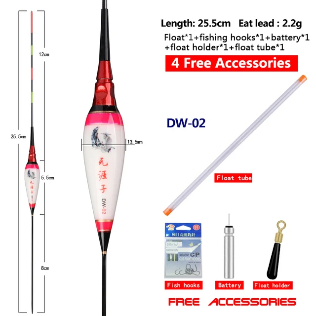 DW-02: longitud del artículo: 25,5 cm, longitud del pie: 8cm, longitud de la cola: 12cm, longitud del cuerpo: 5,5 cm, peso del artículo: 2,03g, peso del plomo de carga: 2,2g, diámetro del pie: 1,2mm, diámetro del cuerpo: 13,5mm, diámetro de la cola: 1,5mm, segmentos: 4