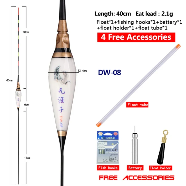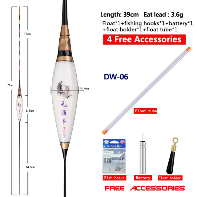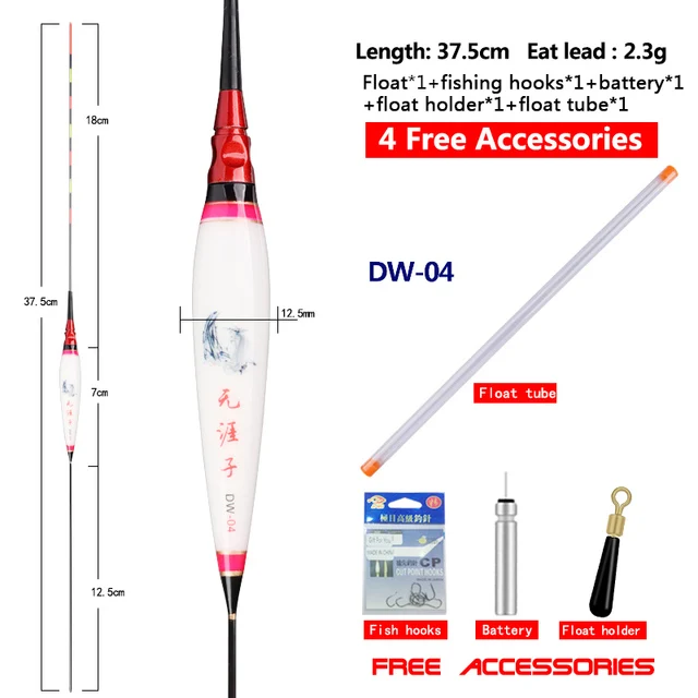 DW-04: longitud del artículo: 37,5 cm, longitud del pie: 12,5 cm, longitud de la cola: 18cm, longitud del cuerpo: 7,0 cm, peso del artículo: 2,18g, peso del plomo de carga: 2,3g, diámetro del pie: 1,2mm, diámetro del cuerpo: 11,4mm, diámetro de la cola: 1,5mm, segmentos: 7