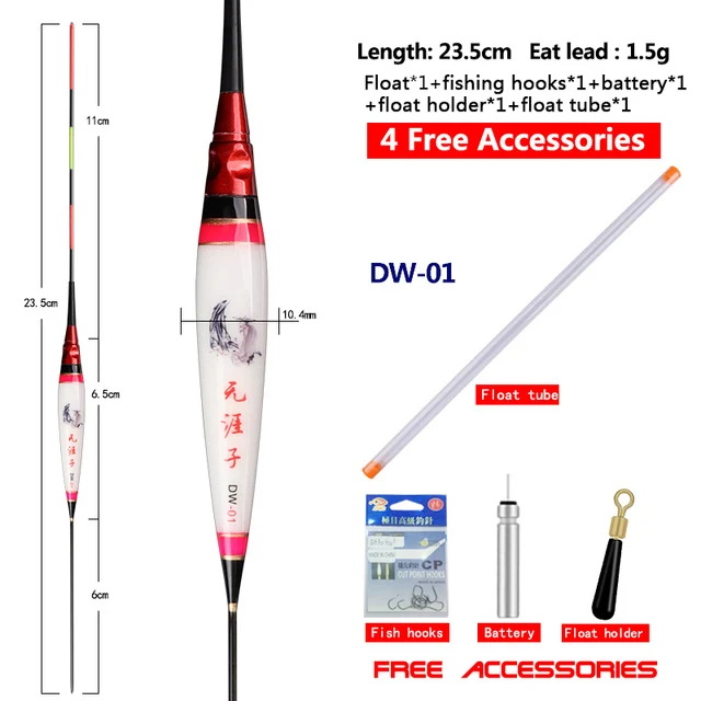 DW-01: longitud del artículo: 23,5 cm, longitud del pie: 6cm, longitud de la cola: 11cm, longitud del cuerpo: 6,5 cm, peso del artículo: 1,91g, peso del plomo de carga: 1,42g, diámetro del pie: 1,2mm, diámetro del cuerpo: 11,5mm, diámetro de la cola: 1,5mm, segmentos: 3