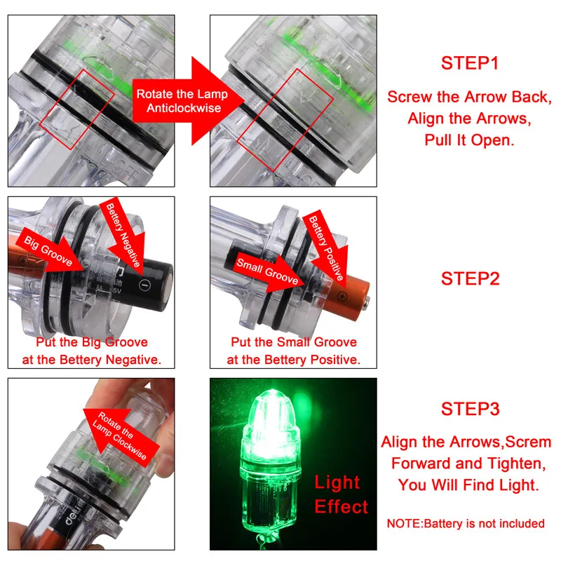 3.El bajo consumo de energía extiende la vida útil de la batería.Cada luz de pesca requiere 2 pilas AA.(pilas no incluidas)