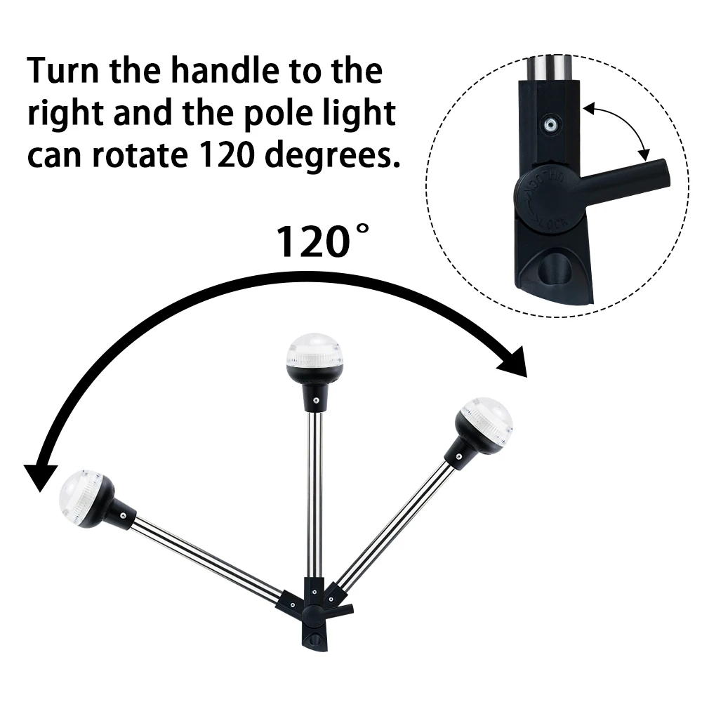 Turn the handle to theright and the pole lightcan rotate 120 degrees