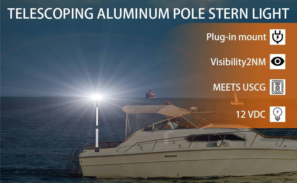 Luz de popa telescópica, luces de navegación, USCG blanco redondo 2NM, base enchufable extraíble de 2 pines, 12-24 VCC, 29,5-44 pulgadas, para barcos pontones