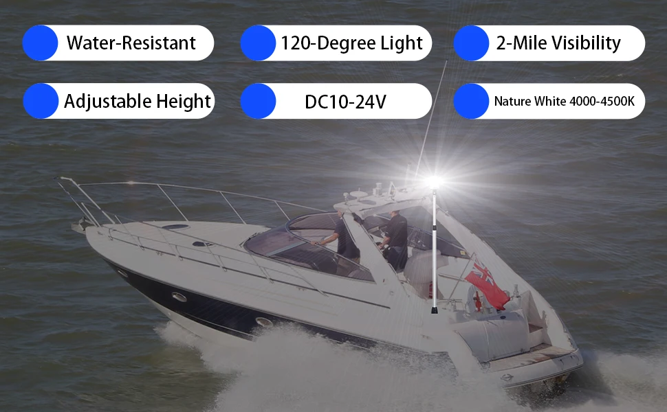 (1) COMPLIANTE DE USCG: Luz de navegación LED blanca integral visible hasta 2 millas náuticas, que funciona con alimentación de 12-24 V CC para una iluminación marina confiable