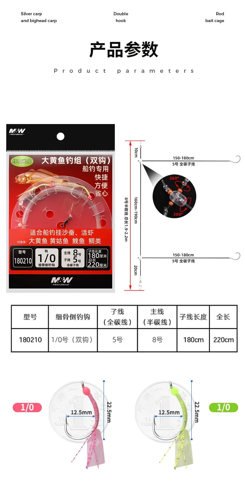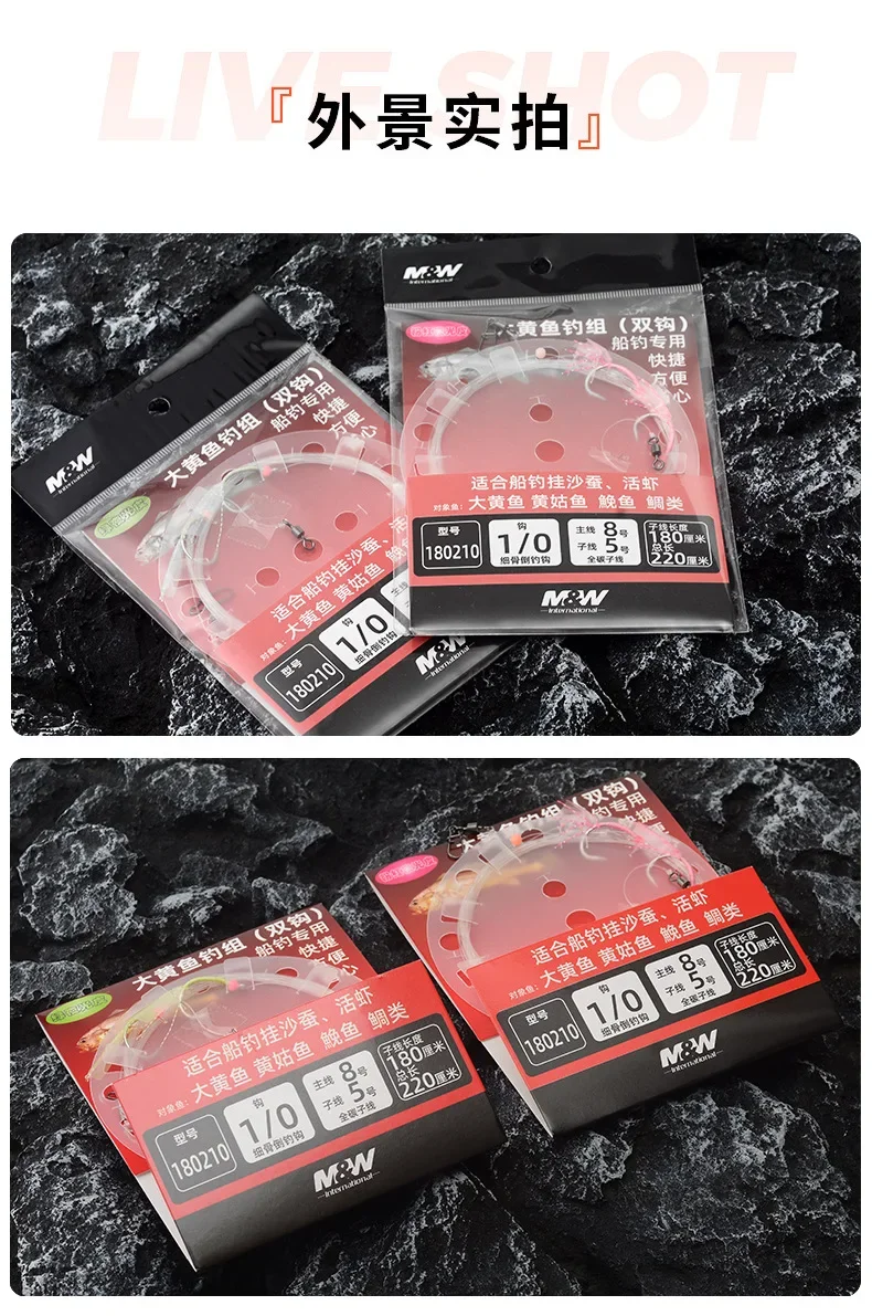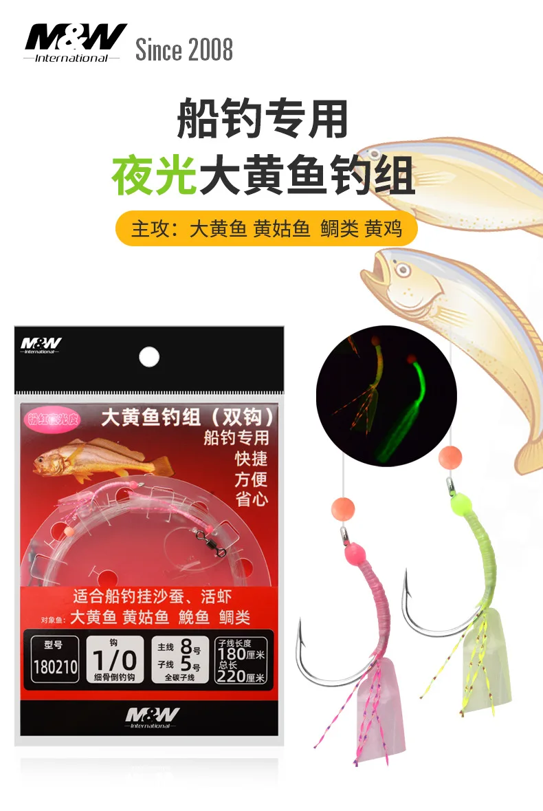 M & W pesca en el mar, corvina amarilla grande, cadena de goma luminosa, juego de pesca con doble gancho, cebo con señuelo vivo