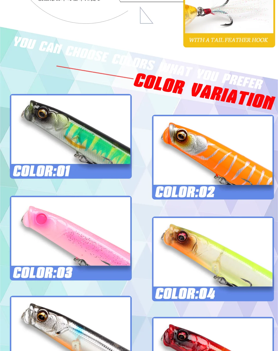1. Este lápiz tiene un cuerpo aerodinámico, que reduce el impacto de la resistencia al viento en el cebo y puede lograr una distancia de lanzamiento más larga.