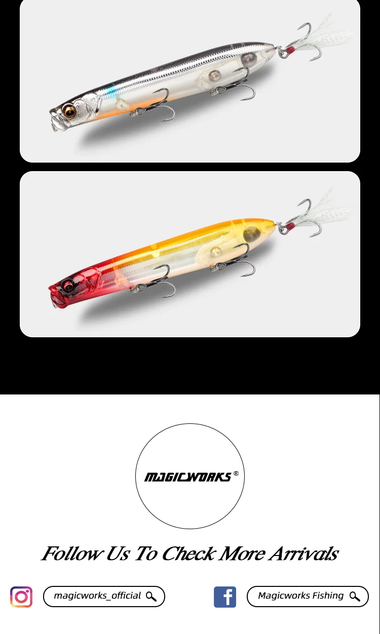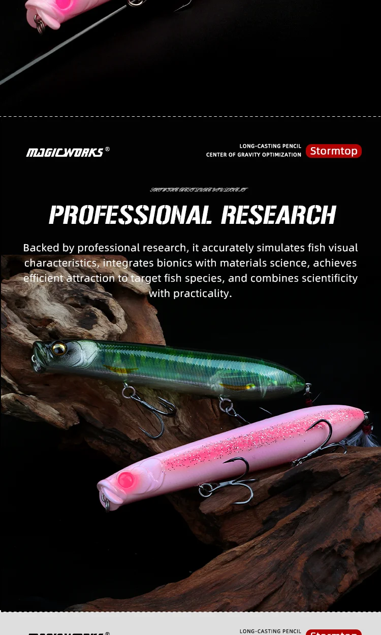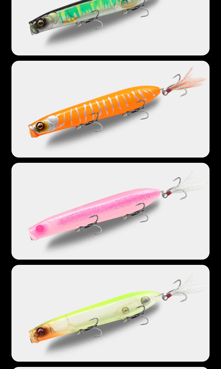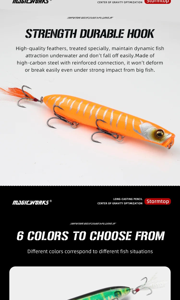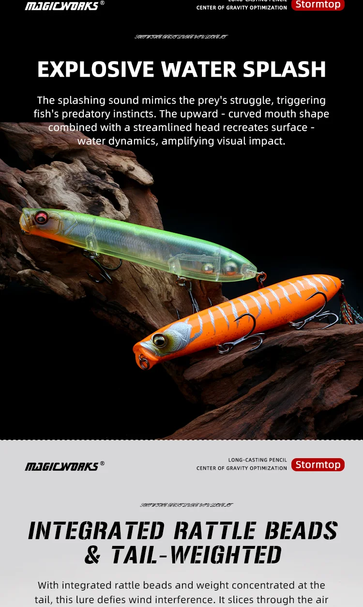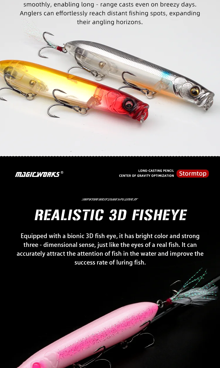 5. Con cuentas de sonajero integradas y peso concentrado en la cola, este señuelo desafía la interferencia del viento. corta el aire suavemente, lo que permite lanzamientos de largo alcance incluso en días de brisa. Los pescadores pueden llegar sin esfuerzo a lugares de pesca distantes, ampliando sus horizontes de pesca.