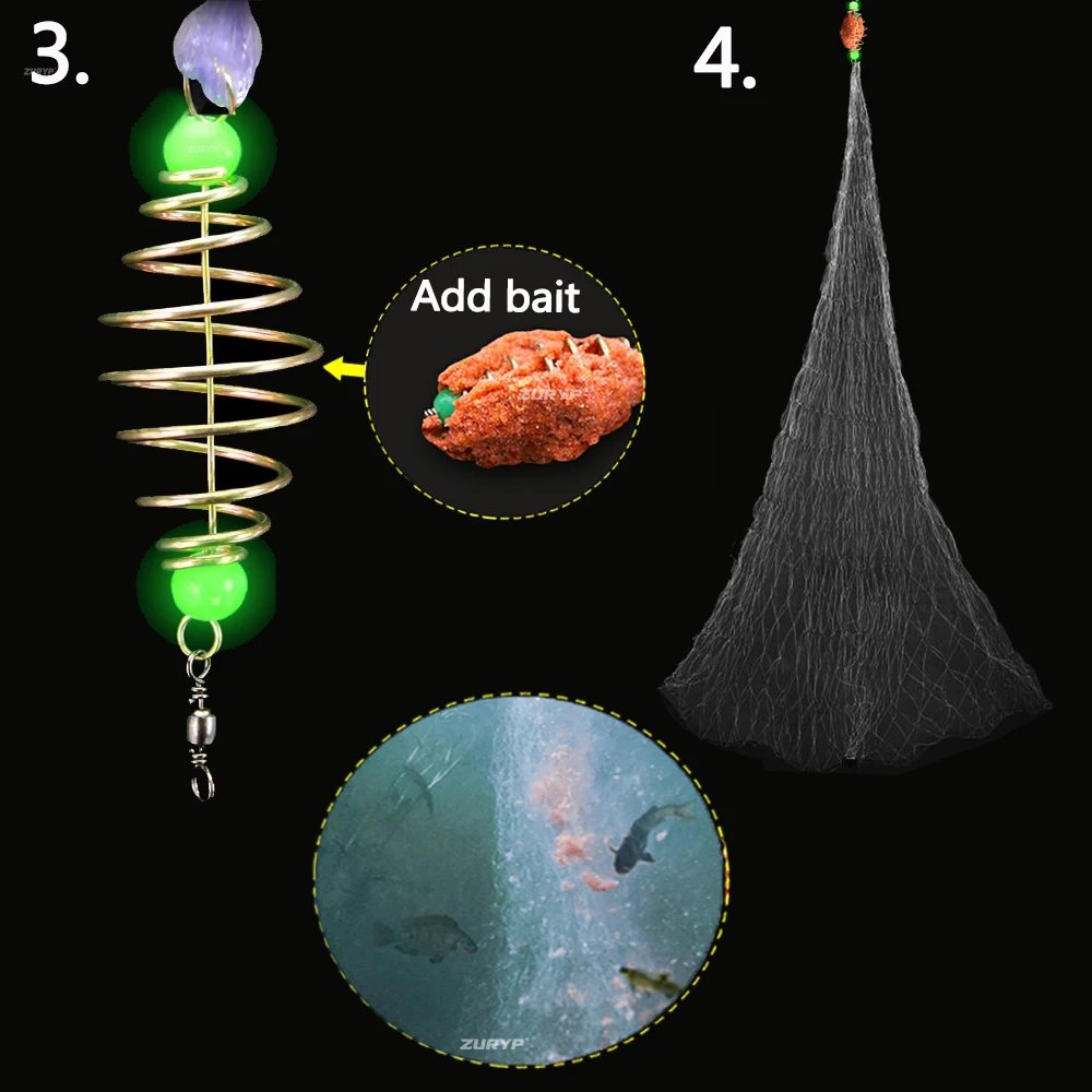 El principio es el mismo que el de la red de enmalle. Coloque el cebo en el anillo de resorte, coloque la red donde haya muchos peces y manténgala quieta, La flotabilidad abrirá la red. El cebo nebulizado atrae a los peces para alimentarse, y la red los atrapará.