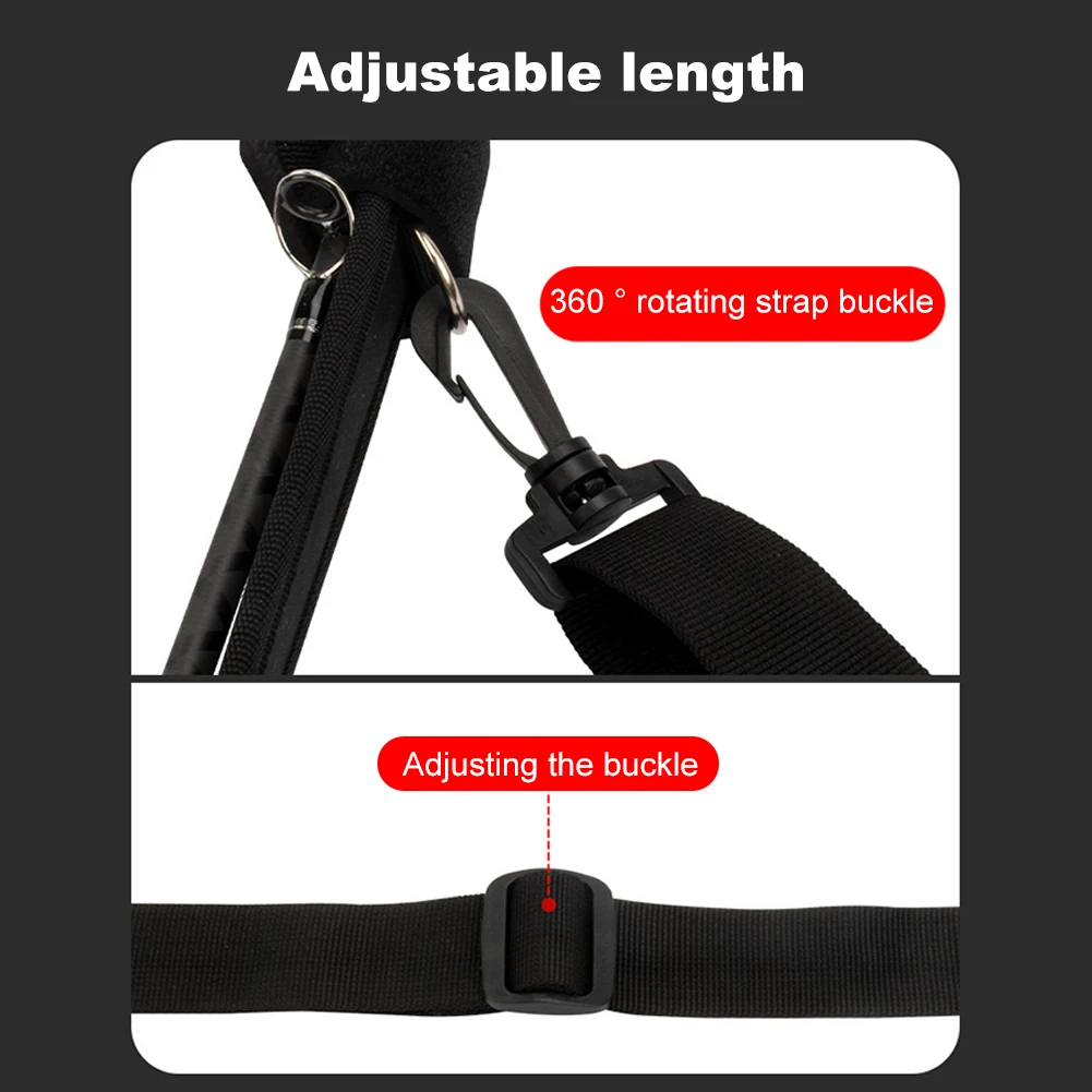 3.360° Hebilla de bloqueo giratoria para una fijación segura:El 360° Hebilla de bloqueo giratoria de protector de varillapermite una fijación segura y un uso conveniente.Con esta función, puede ajustar y apretar fácilmente la correa para garantizar un agarre firme de su caña de pescar, brindándole tranquilidad durante el transporte.