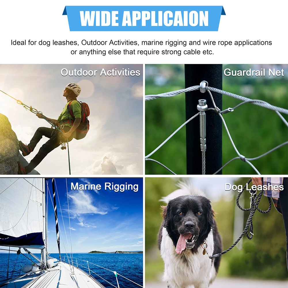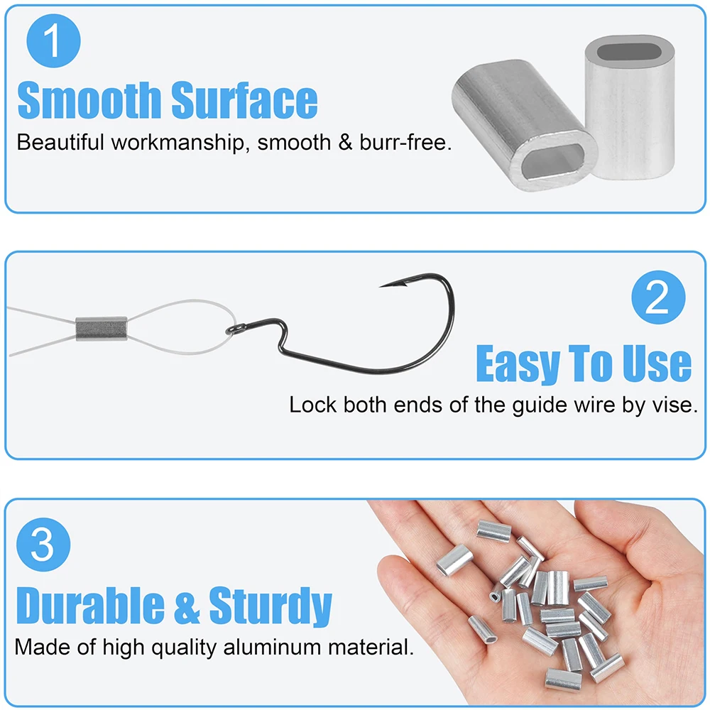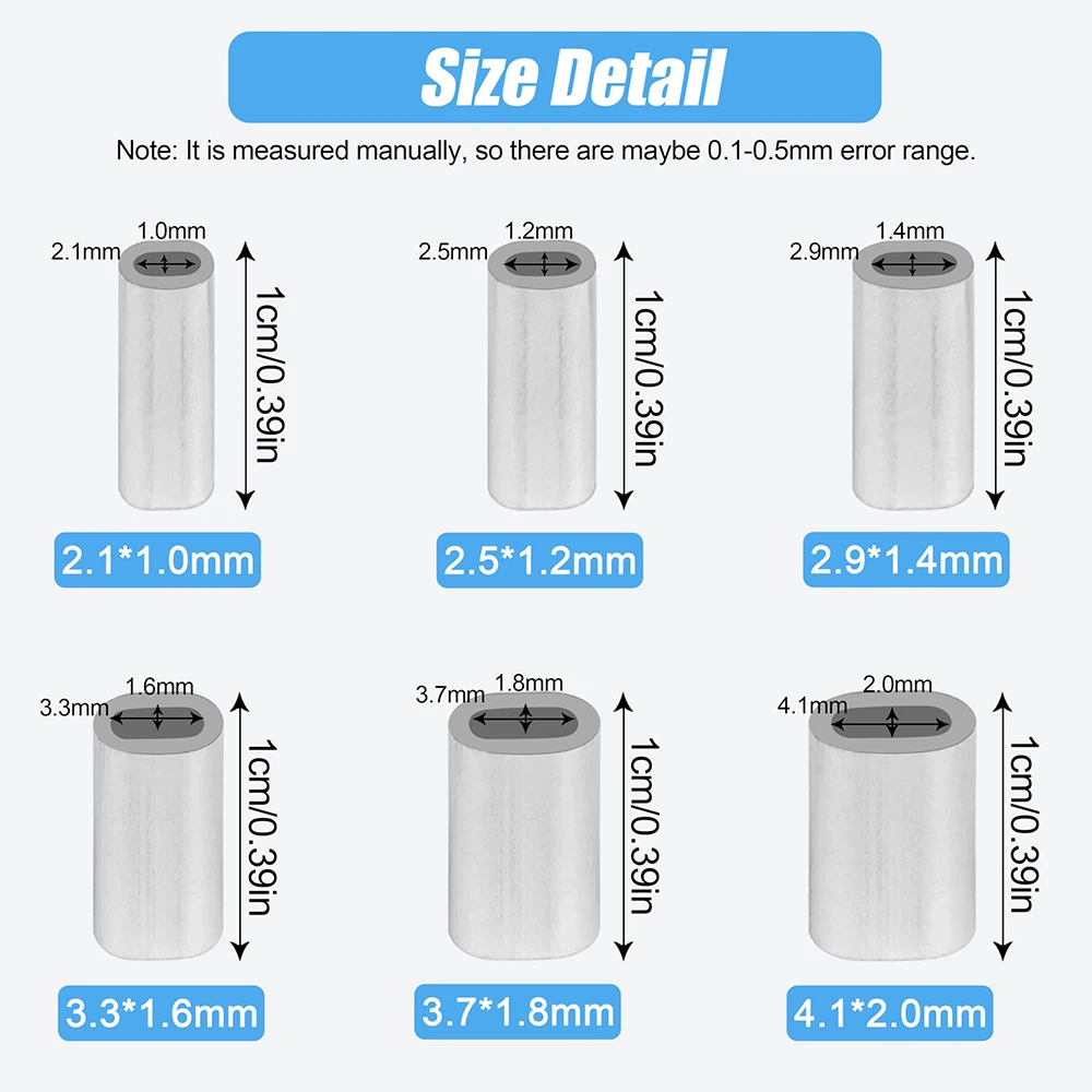 Amplia aplicación: las fundas de engarce ovaladas de aluminio tienen una amplia gama de aplicaciones en aparejos de pesca, como mono, alambre, cable u otros materiales líderes, correas para perros, tendederos, etc.