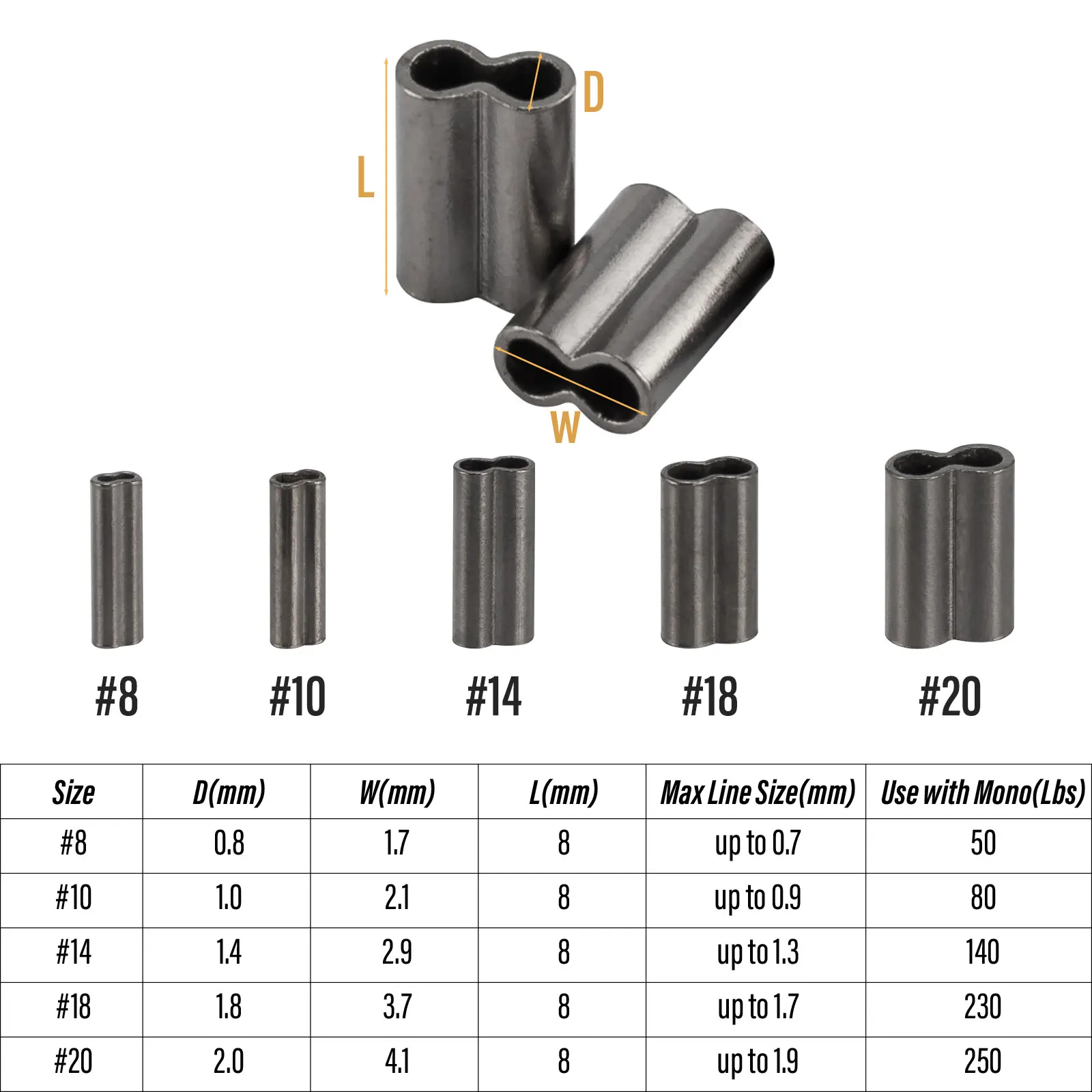 【Paquete incluido】Paquete de 275/caja, 5 tamaños mezclados. 0,8mm-Paquete de 75, 1,0mm-Paquete de 75, 1,4mm-Paquete de 75, 1,8mm-Paquete de 25, 2,0mm-Paquete de 25. Uso con Mono Lbs: 50-250Lb.