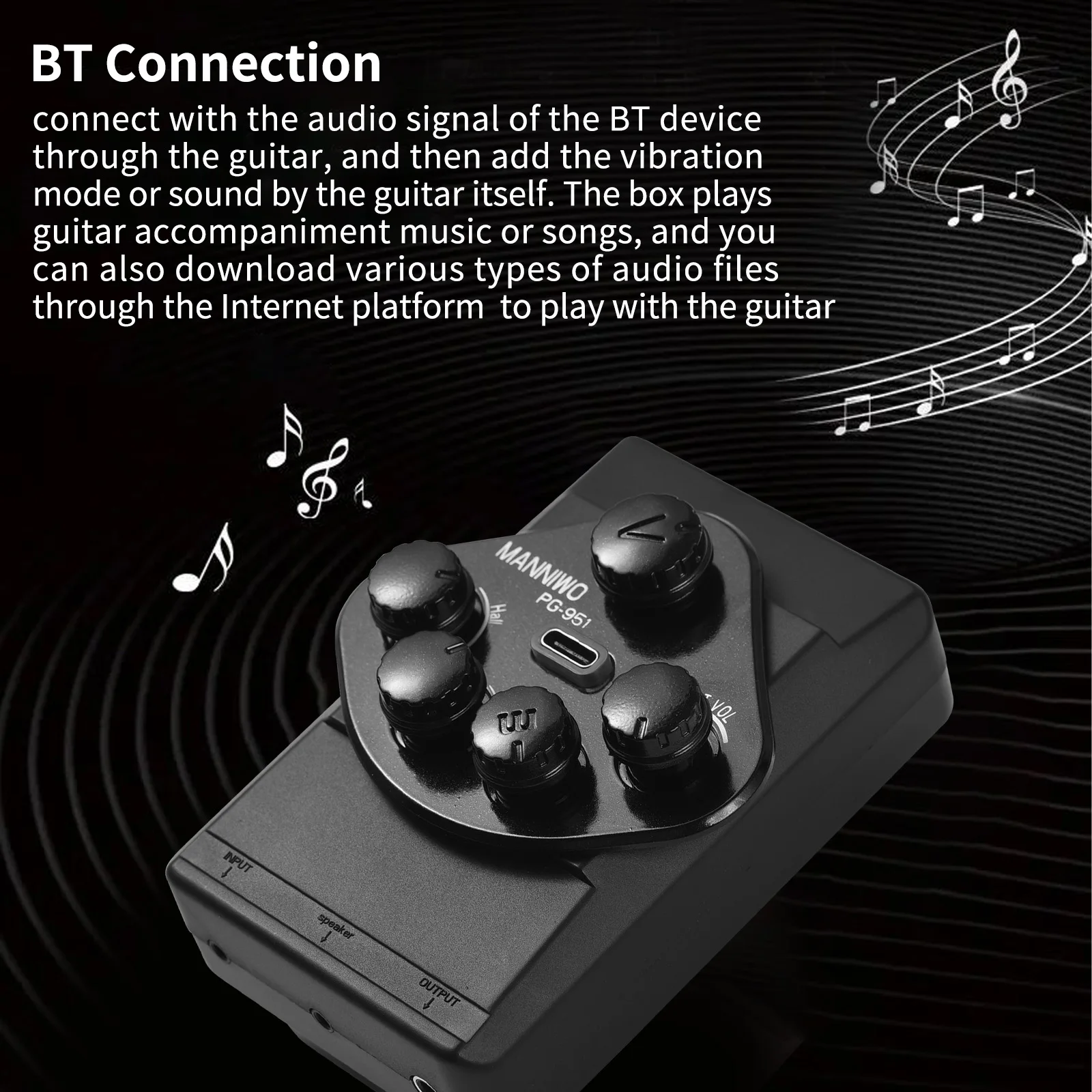 Conexión BT: Conéctese con la señal de audio del dispositivo BT a través de la guitarra y luego añada el modo de vibración o sonido de la propia guitarra. La caja reproduce música o canciones de acompañamiento de guitarra, y también puede descargar varios tipos de archivos de audio a través de la plataforma de Internet para tocar con la guitarra,